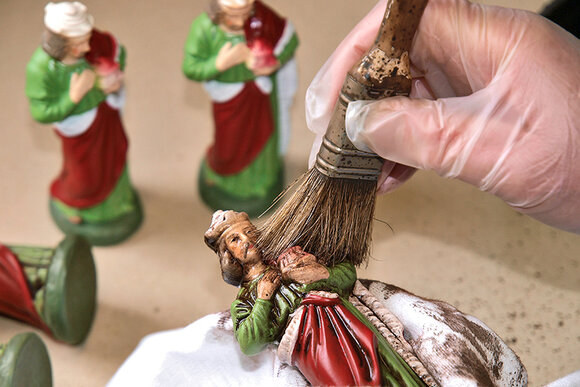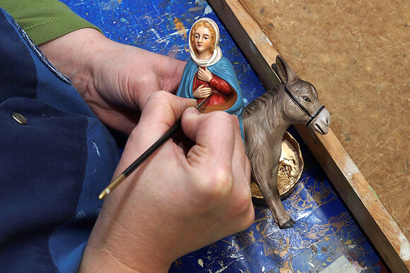 Die Oberflächen der fertig aufgestellten Figuren werden zunächst in einem Leimbad egalisiert, um einen gleichmässigen Farbauftrag zu gewährleisten. Anschließend werden die großen Flächen, wie Kleider und Hosen, mit feinen Airbrushpistolen farblich gestaltet. Danach verleihen meisterliche Maler den Figuren Ausdruck und Lebendigkeit. Eine abschließend sorgfältig aufgebrachte Patina verstärkt den Eindruck von Plastizität und Tiefe. Vollendet werden die Figuren durch das Aufbringen diverser Golddekore.