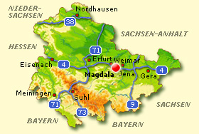 Die Kleinstadt Magdala im grünen Herzen Deutschlands liegt an der A4. In 10 Minuten erreicht man die Städte Weimar, Jena und Apolda. Alle drei Städte sind aber auch mit den öffentlichen Nahverkehr zu erreichen. Die Landeshauptstadt Erfurt liegt nur 30 Autominuten von Magdala entfernt.