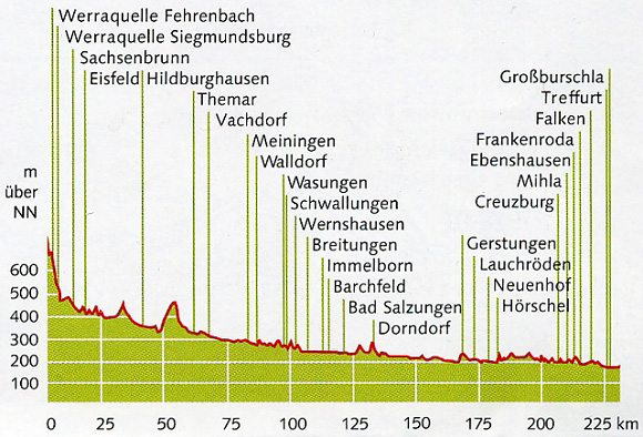 Ausgangspunkt in Thüringen: 1. Werraquelle: Siegmundsburg, nächster Bhf. Eisfeld 8,5 km; 2. Werraquelle: Fehrenbach, nächster Bhf. Eisfeld 13,5 km
