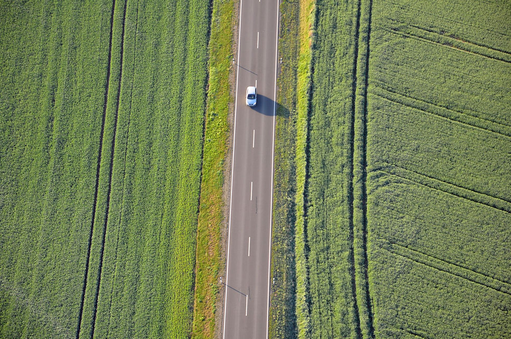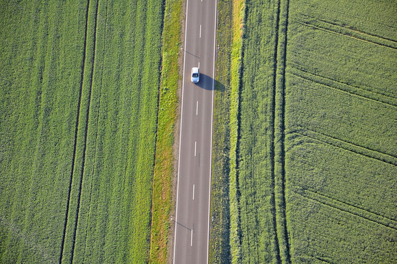 Ortschaften, Autos und Bäume wirken von oben gesehen wie Spielzeug.