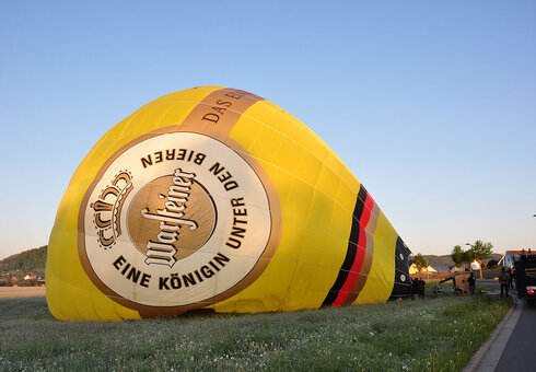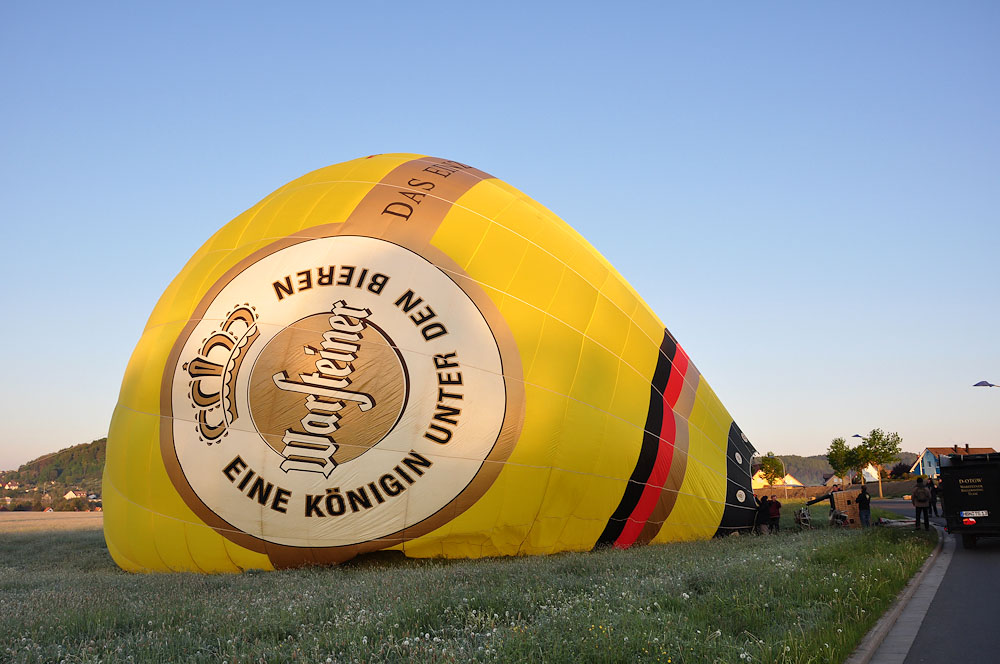 Nach der Landung steigt einer nach dem anderen aus, ganz nach Aufforderung durch den Piloten. Zur Stärkung gibt es jetzt erst einmal ein Bier oder Radler vom Sponsor des Ballons (in der Regel eine Brauerei).