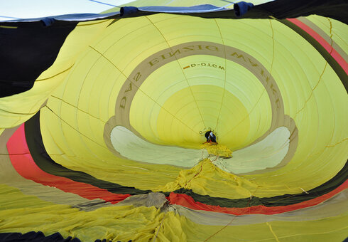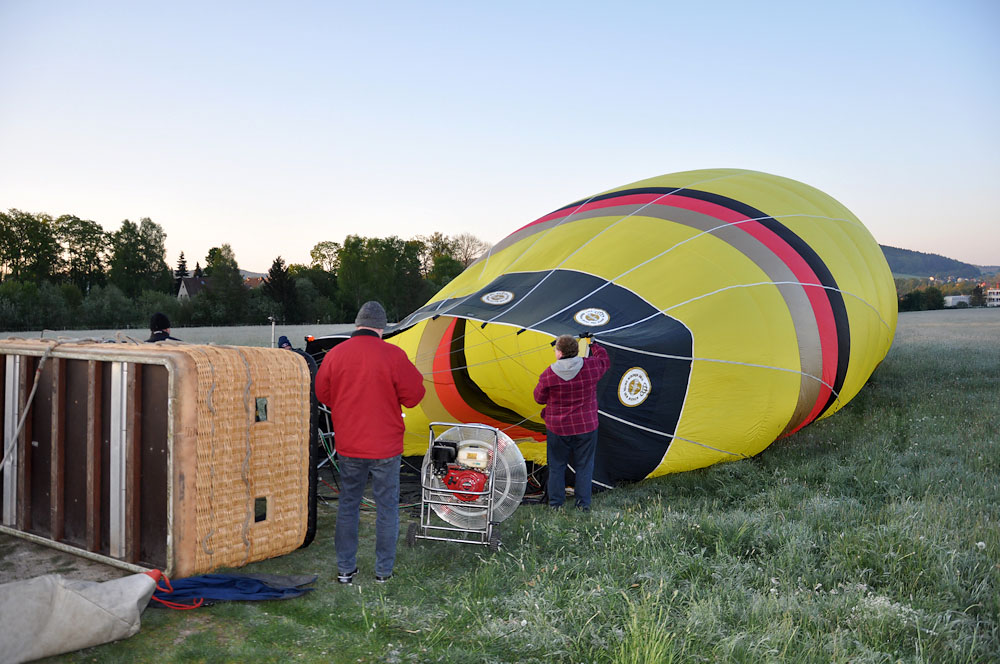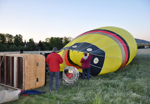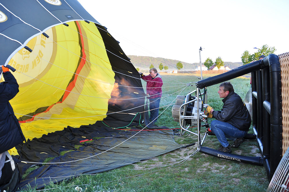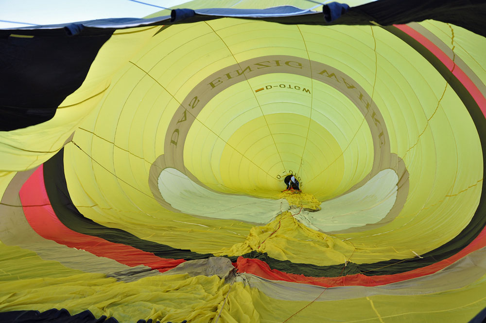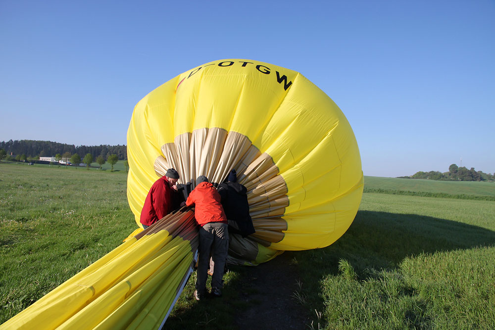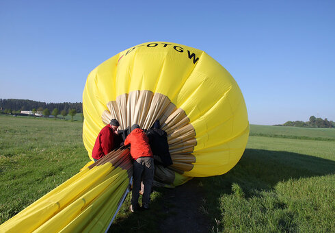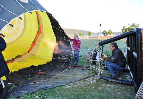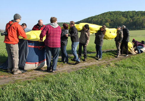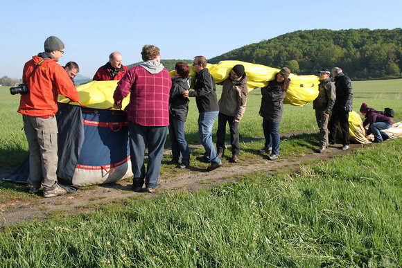 Der Spaß einer Ballonfahrt beginnt in der Regel mit dem gemeinsamen Ausrollen des Ballons, dem Aufstellen des Korbes und wichtigen Anweisungen des Piloten.