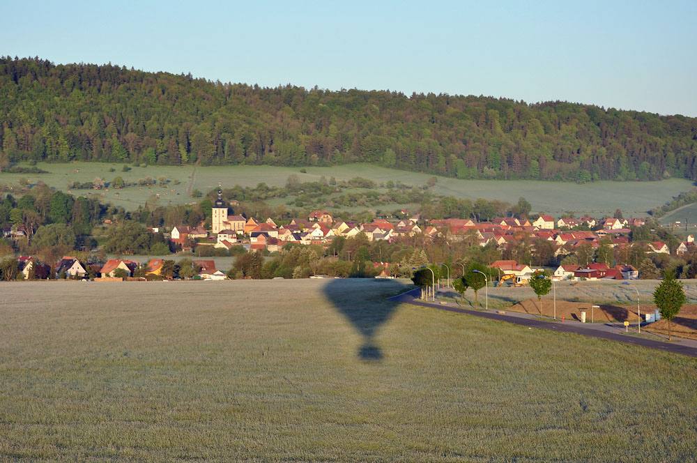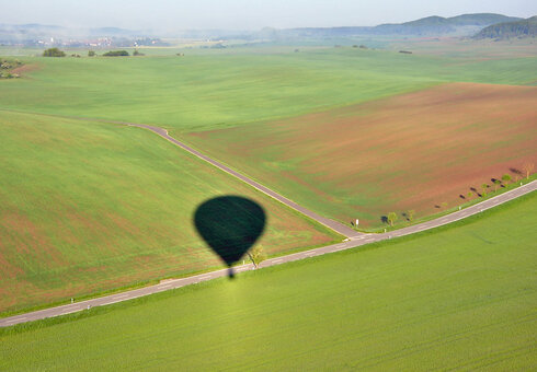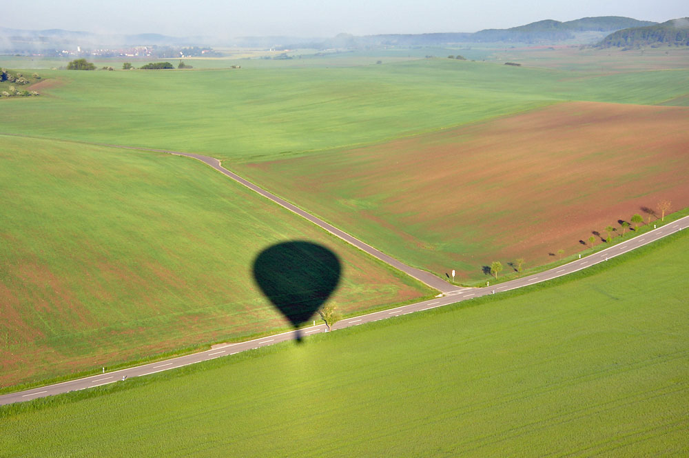 Anschließend geht es ganz allmählich und ruhig nach oben. Der Schatten des Ballons wird mit zunehmender Höhe allmählich immer kleiner und begleitet einem während der kompletten Ballonfahrt.