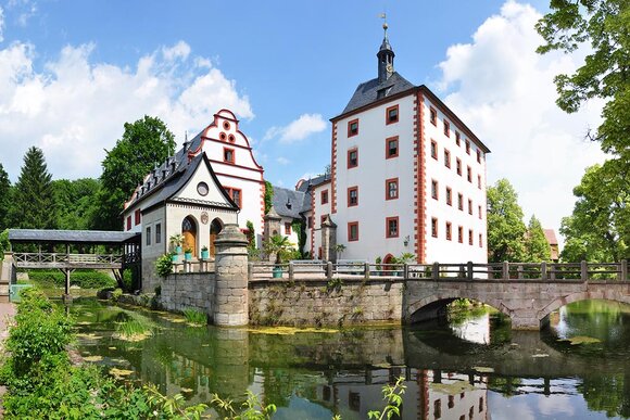 Mehr InformationenDas Ensemble aus Schloss, Park und Theater gewann seit dem 16. Jahrhundert als Rittergut der von Schönfeld und der von Stein seine heutige Gestalt. Goethe besuchte zwischen 1776 und 1788 in diesem idyllischen Wasserschloss Charlotten von Stein. Aus Stein`schen Besitz stammende Möbel, Gemälde und Zeichnungen erzählen von dieser berühmten Liebe. Audioguide und Hörstation "Hier sitz ich auf deinem Canapee" machen sie erlebbar. Der romantische Landschaftspark lockt mit "Blumentheater", Grotte, Badehäuschen und künstlicher Ruine. Im klassizistischen Liebhabertheater, das zur Europastraße Historische Theater gehört, werden von Mai bis Oktober Opern und Theaterstücke in historischer Aufführungspraxis gespielt, Kammerkonzerte und Lesungen veranstaltet.