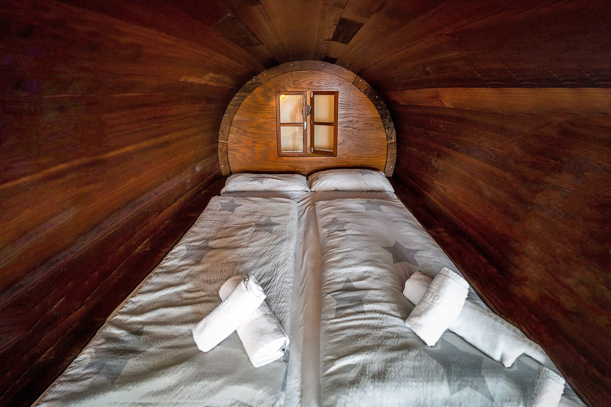 Für Romantiker gibt es die Möglichkeit, in einem Bierfass zu übernachten (2 Personen).