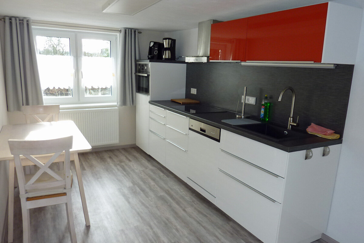 separate Küche mit moderner Einbauküche, Couch und Essbereich