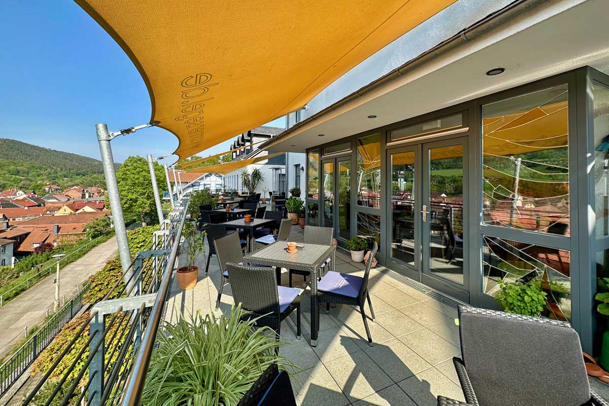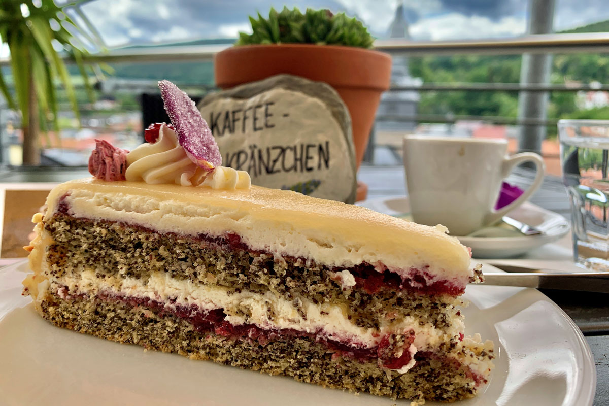 Besuchen Sie unser mittels Aufzug barrierefrei erreichbares Terrassen-Café mit seinem einzigartigen Ausblick auf die Stadt, von sanften Hügeln und Wäldern umgeben.