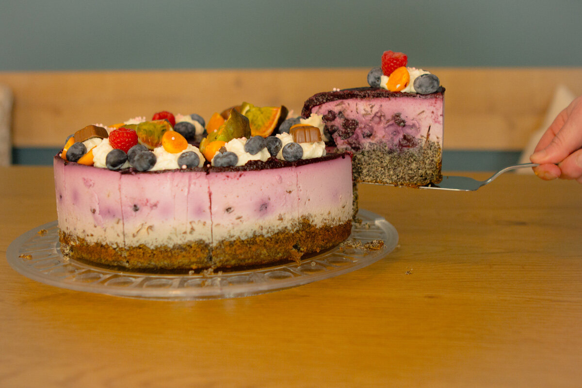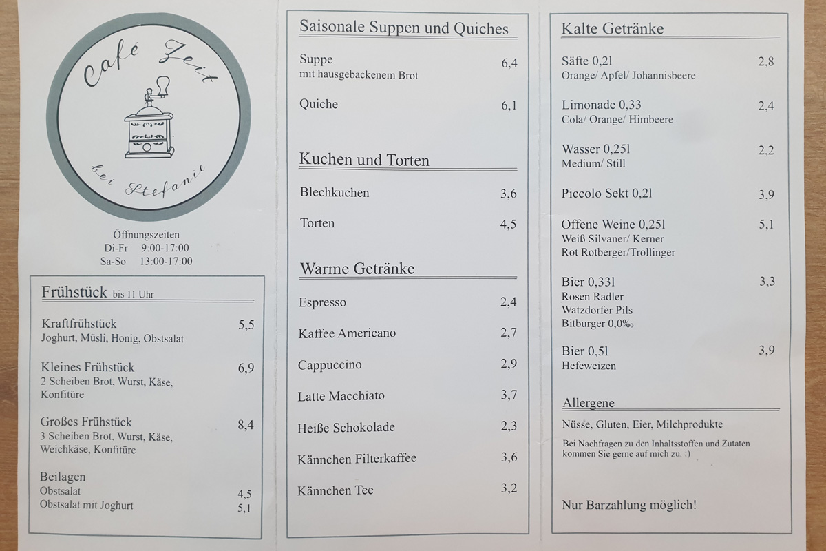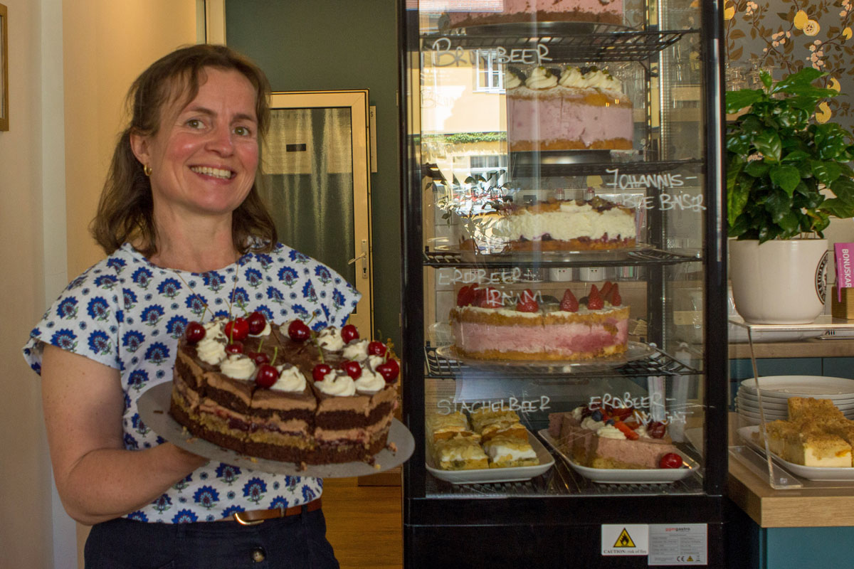 Das Café verfügt über 30 Sitzplätze und bietet ein wechselndes Angebot aus selbstgebackenen Torten & Kuchen, saisonellen Suppen und Quiche sowie Softeis und Kaffee aus einer Privatrösterei der Region.