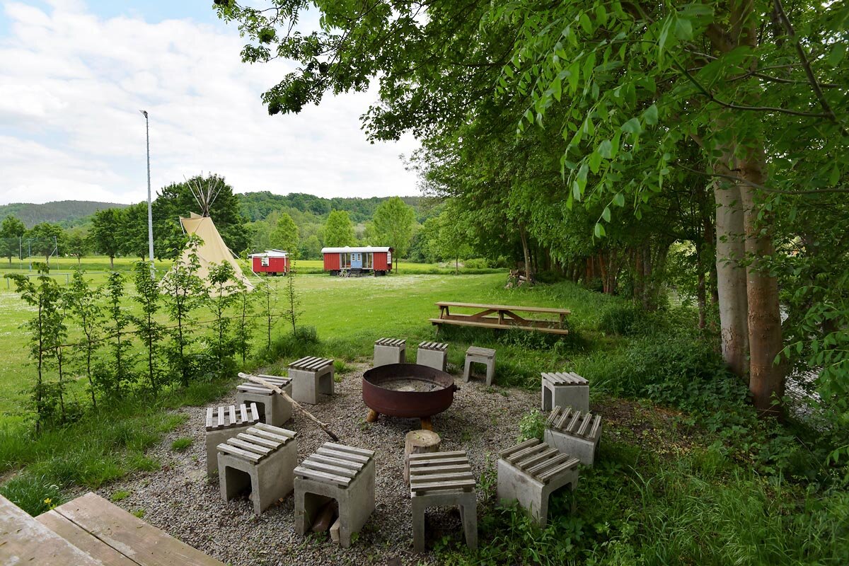 Unser Platz verfügt über eine großzügige Feuerstelle, ein Tipi für bis zu 20 Personen, eine Zeltwiese und Stellplätze für Wohnmobile mit Stromanschlüssen und Sanitärbereich. Wer ohne Zelt unterwegs ist kann Zuflucht in unserer "Bounty" suchen, einem umgebauten Segelboot.