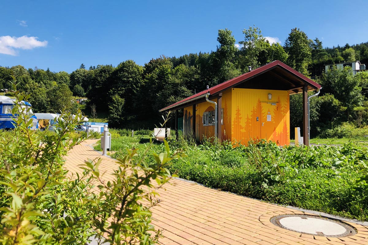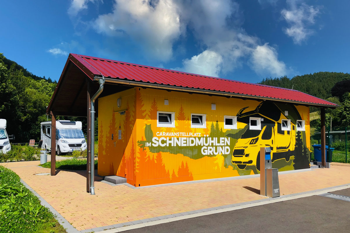 Unser 2019 neu errichteter Wohnmobilstellplatz liegt im Grünen am Ortsrand Kleinschmalkaldens und bietet eine gehobene Ausstattung. Auf dem Stellplatz stehen acht Parkplätze für Wohnmobile zur Verfügung. Ein modernes Funktionsgebäude mit barrierefreiem Zugang zu Duschen und Toiletten steht zur Nutzung bereit, außerdem gibt es Platz zum Spielen und eine Grillmöglichkeit.
