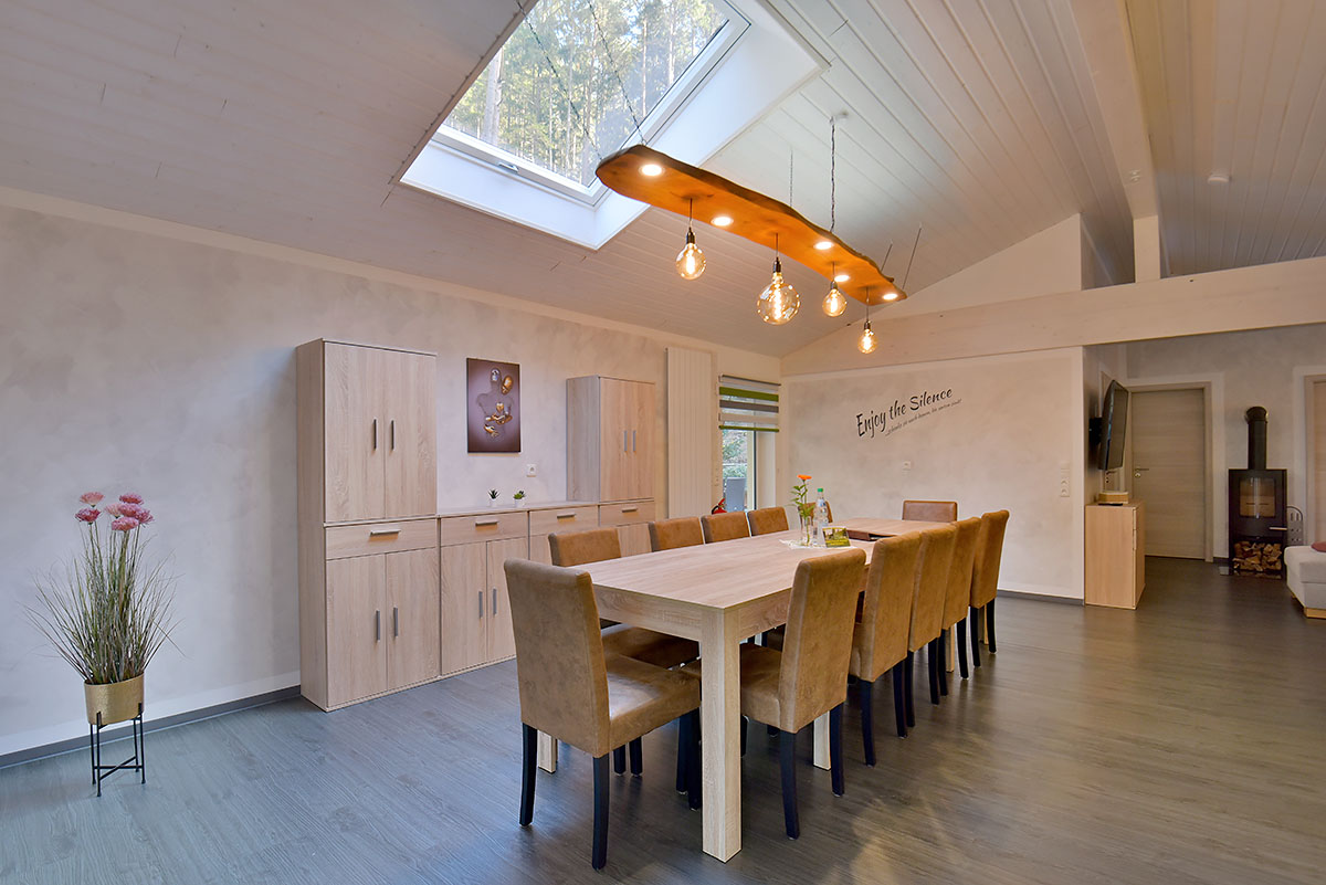 Beliebt ist auch unser "Fuchsbau" - ein Aufenthaltsraum für Familientreffen, Workshops usw. (inkl. TV, orig. kanadischer Bullerjan, Edelstahl-Galgengrill u.v.m.)