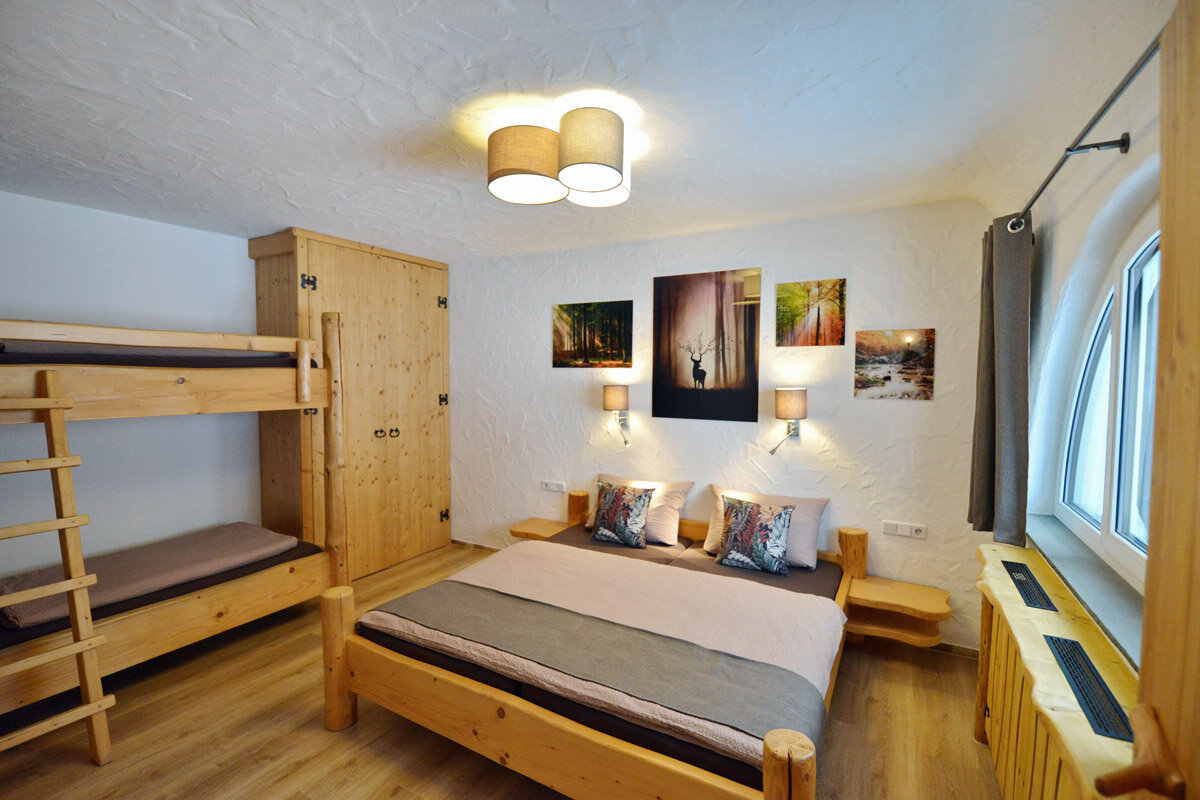 Jedes unserer acht Erdhäuser ist urig und zugleich komfortabel eingerichtet und verfügt auf 45m² über ein Schlafzimmer mit einem Doppel- und einem Doppelstockbett, ein Wohnzimmer, ein Badezimmer sowie eine eigene Terrasse. Die maßgefertigte Eichen- und Rundholzeinrichtung ist ein Unikat und verleiht den Erdhäusern ihren urigen Charme. Ein Erdhaus bietet Platz für zwei bis vier Personen. Buche deinen Wohlfühlurlaub und genieße die kostbare Urlaubszeit in trauter Zweisamkeit, mit der ganzen Familie oder mit Freunden.