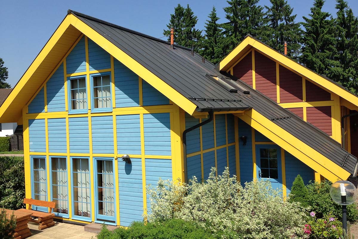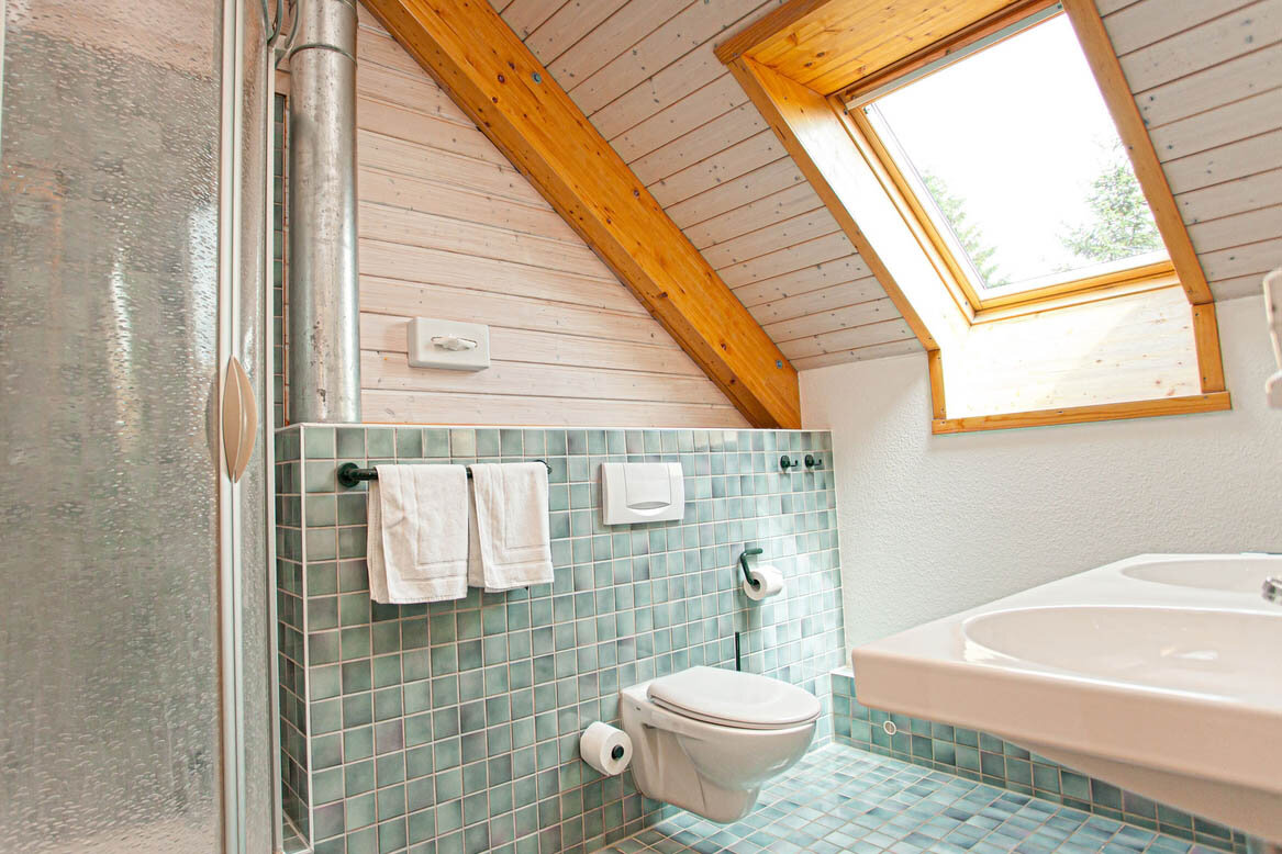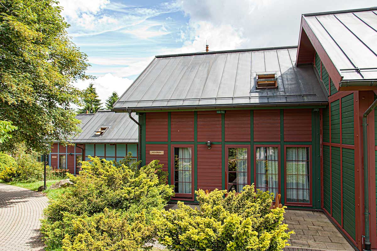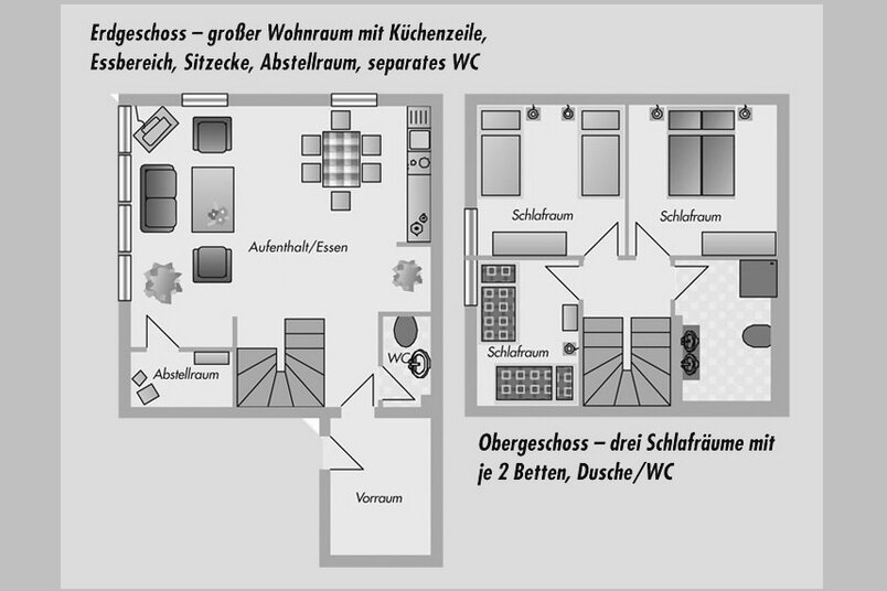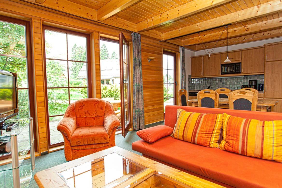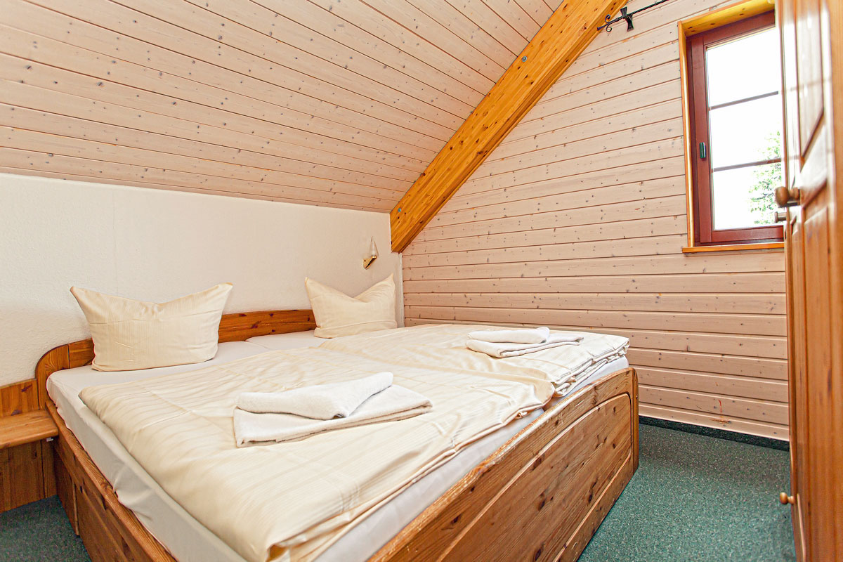 In unseren 8 rustikal eingerichteten Ferienhäusern in Oberhof finden Sie auf 90 qm einen offenen Wohn-, Ess- und Küchenbereich und im Obergeschoss drei Schlafzimmer für je zwei Personen und eine Dusche mit WC.