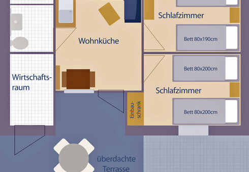 Es erwartet Sie ein geschmackvoll eingerichteter Bungalow mit Platz für 4 Personen. In der Vor- und Nachsaison ist der Bungalow beheizbar.