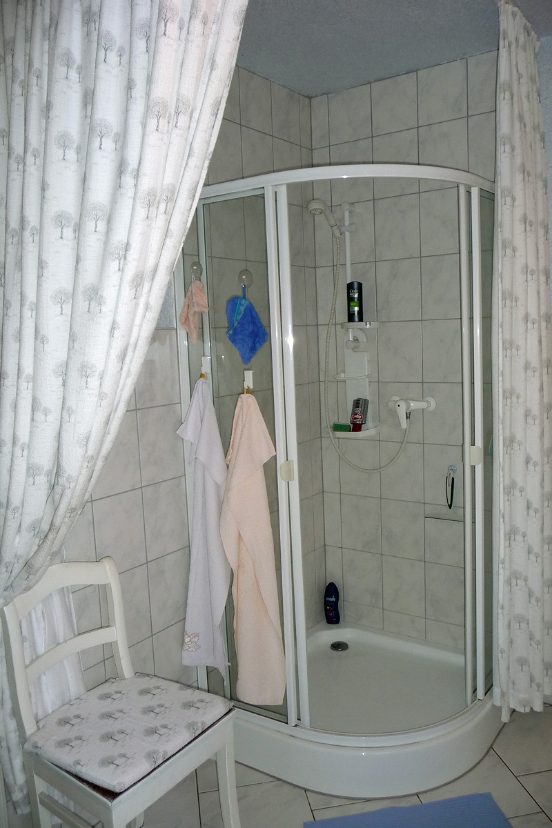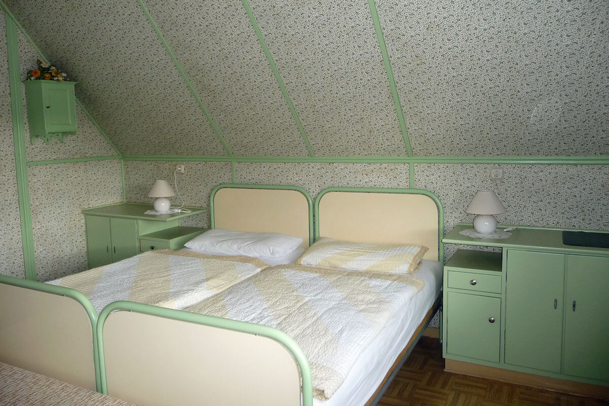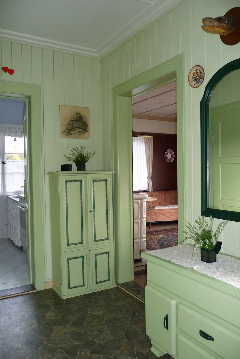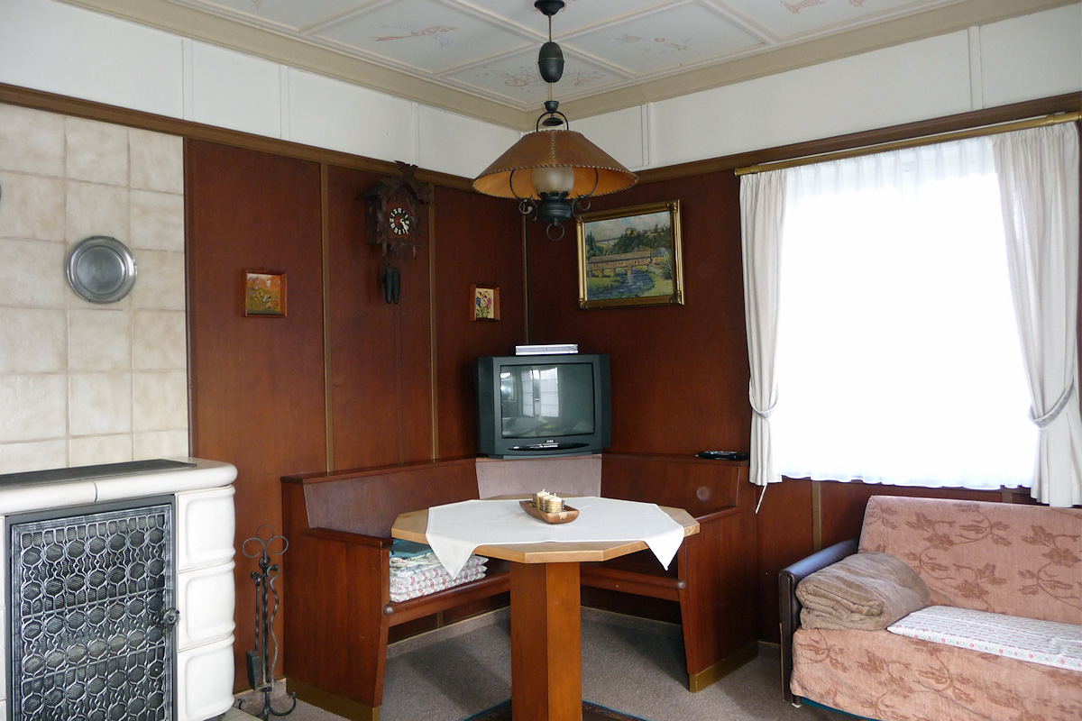 Von hier gelangen Sie in das Wohnzimmer, welches Dank holzvertäfelter Wände und schöner antiker Möbel seinen ganz eigenen Charme ausstrahlt. Ein großer Esstisch, bequeme Sitzmöbel ein Holzofen und TV bzw. Radio stehen zu Ihrer Verfügung. Vom Wohnzimmer gelangen Sie in die gut ausgestattete Küche mit eingebauter Duschecke. Ein separates WC ist ebenfalls vom Flur zugänglich. Im Obergeschoß befindet sich Ihr Schlafzimmer. Einbauschränke bieten ausreichend Platz für Ihre Kleidung und ein zusätzliches Waschbecken gehört zur Ausstattung.