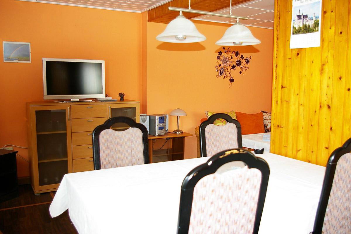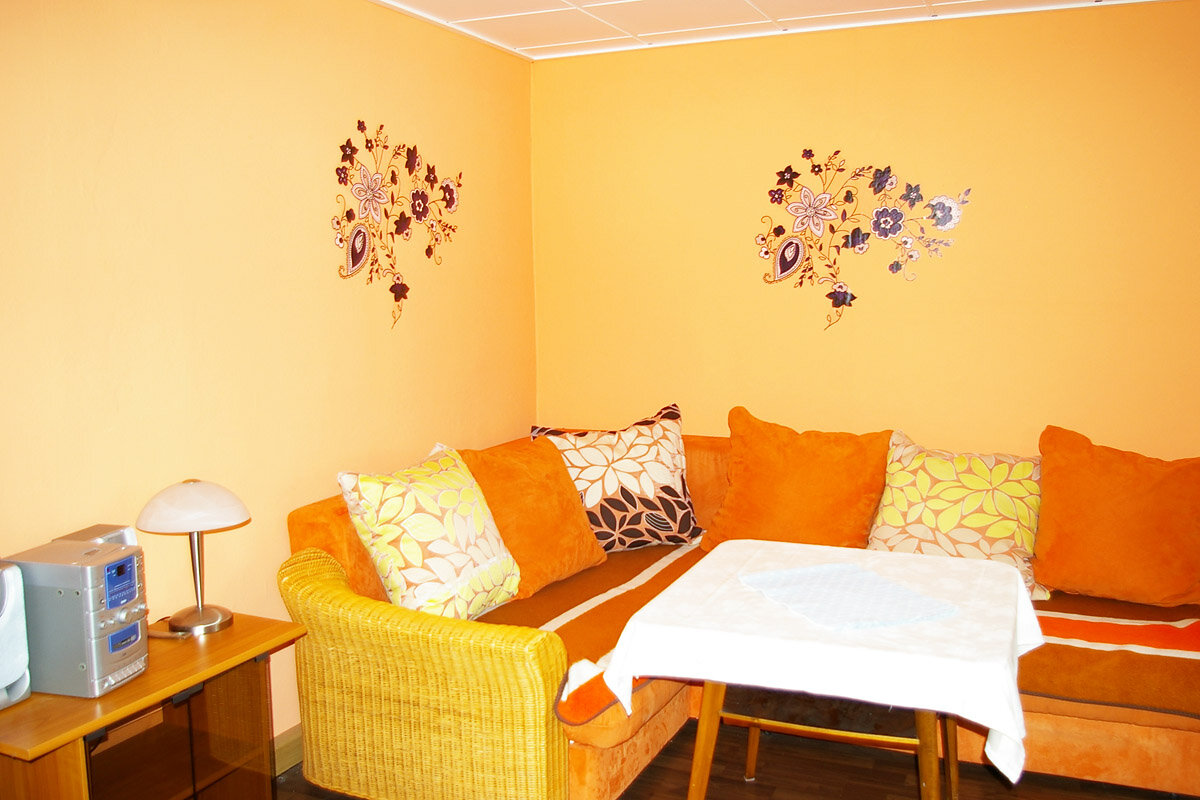Ihre Ferienwohnung liegt ebenerdig im hinteren Teil unseres Grundstückes. Auf 60 qm befinden sich neben einem schön geschnittenen Wohnzimmer mit gemütlicher Sitzecke und TV,