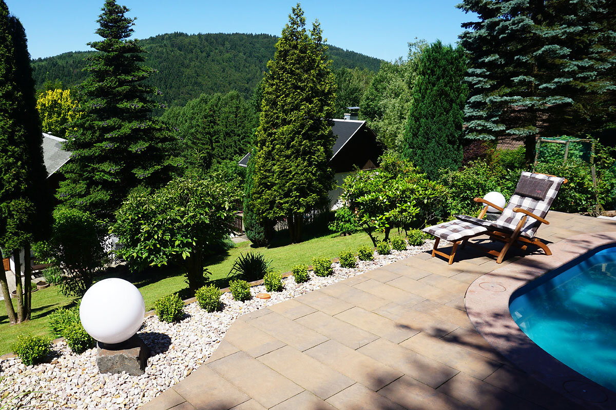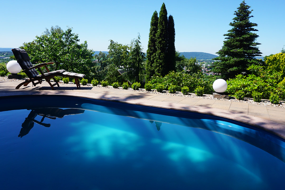 Die schöne Terrasse und eine Lounge Ecke, der Garten mit Pool, mit faszinierendem Ausblick, bieten im Sommer Erholung pur. Im Kräutergarten finden sie frische Gewürzpflanzen und Kräuter zum verfeinern ihrer Gerichte.