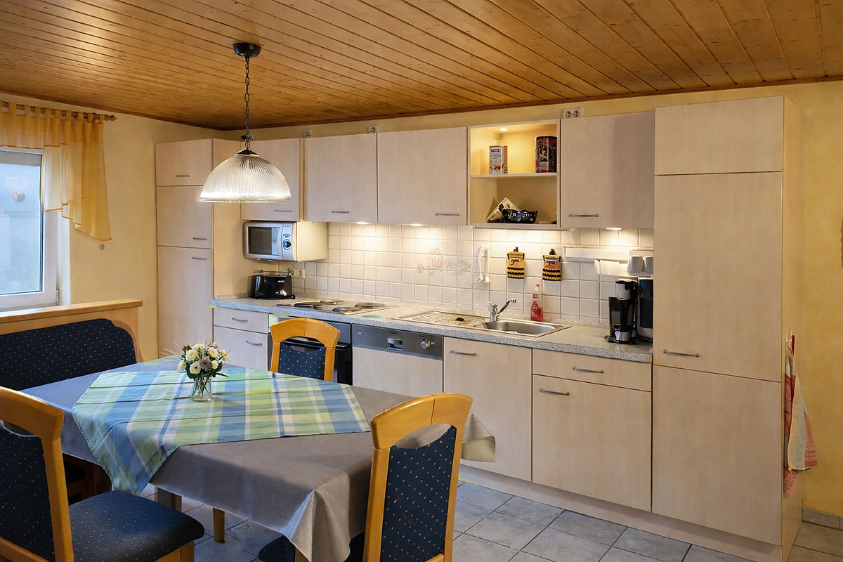 In der modernen Einbauküche befindet sich eine Essecke mit SAT-TV. Die Küche ist komplett ausgestattet mit Kühl-/Gefrierkombination, Mikrowelle, Herd mit Backofen, Geschirrspüler, Kaffeemaschine und Toaster.
