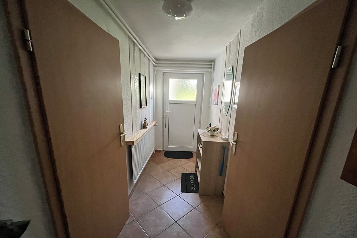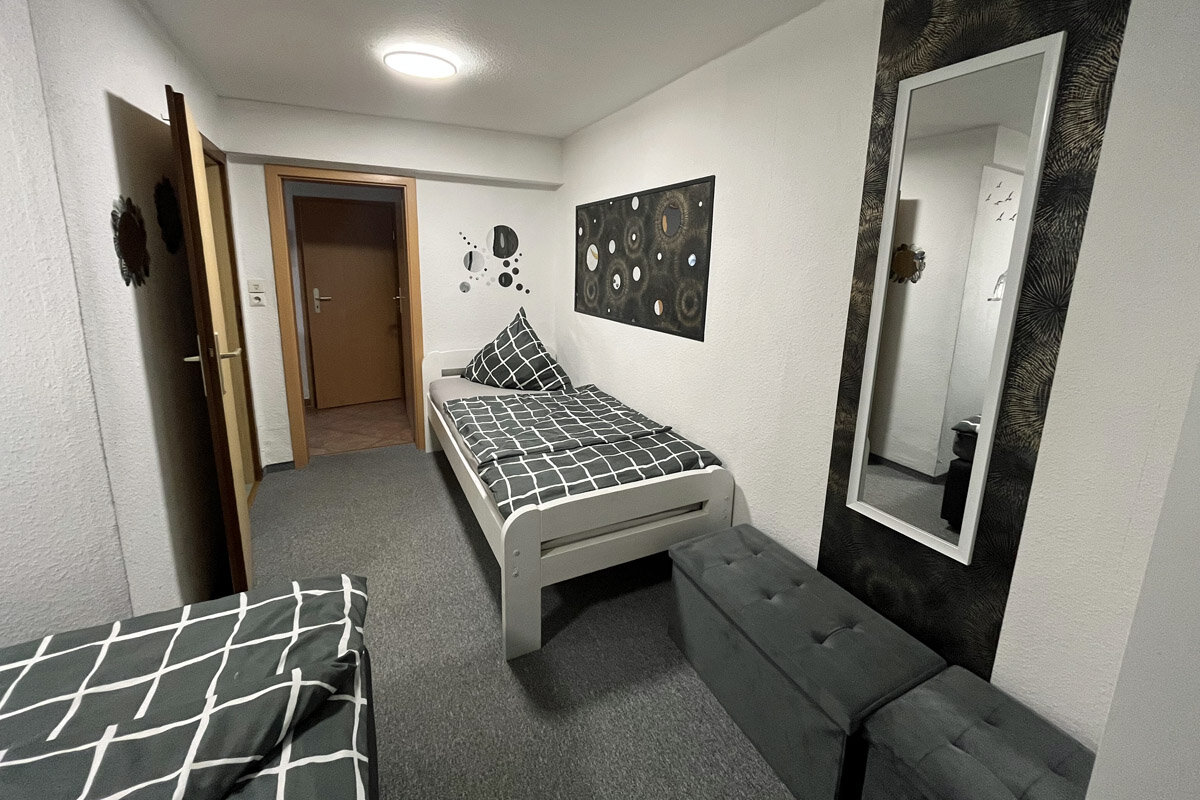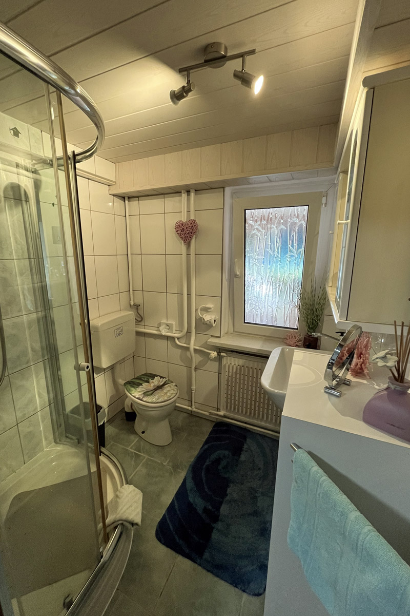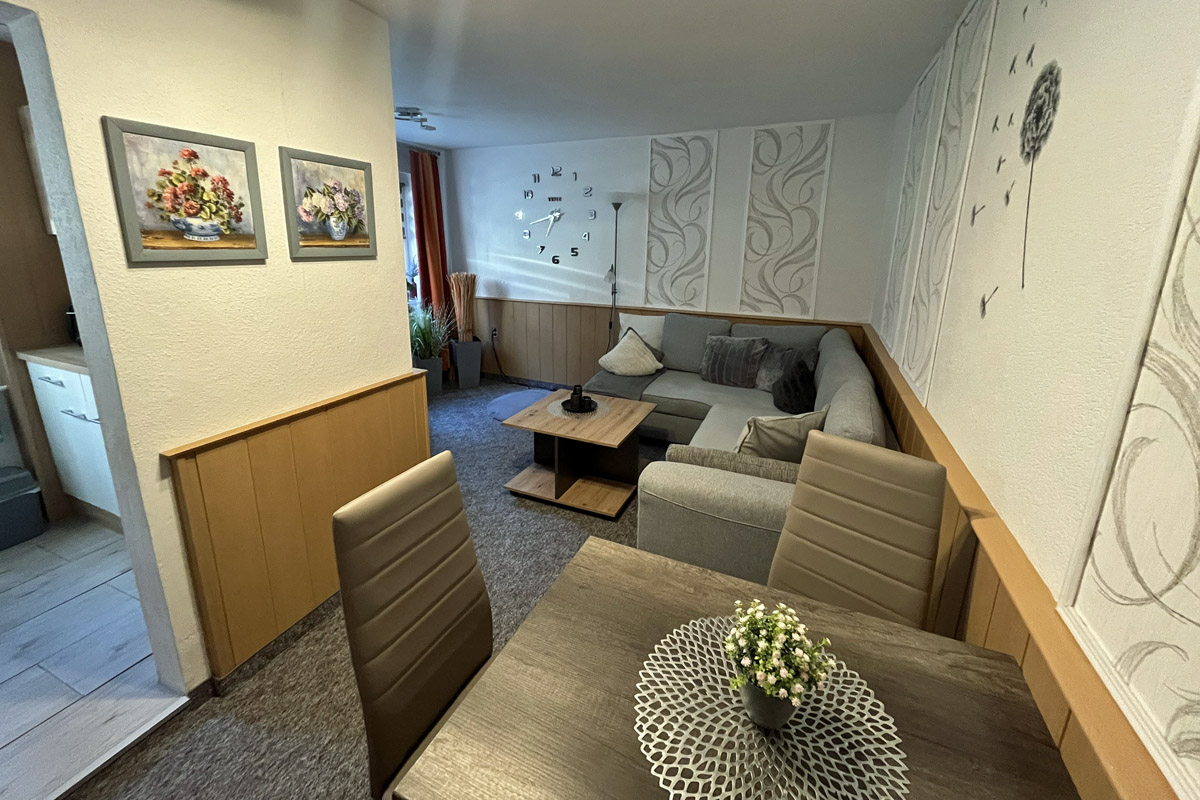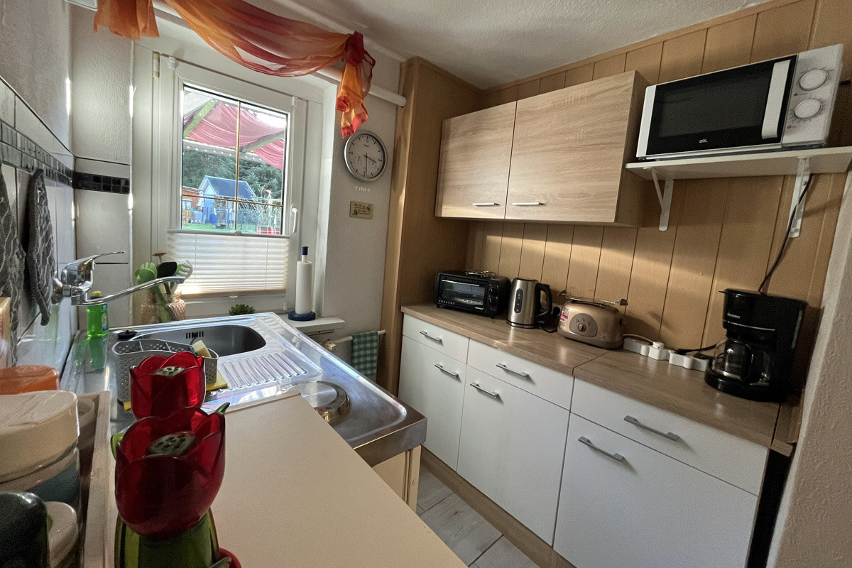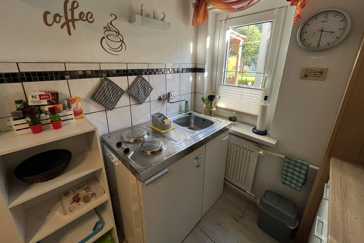 In Ihre ca. 40m2 großen - für bis zu 3 Personen ausgelegten - Ferienwohnung gelangen Sie über einen separaten Eingang. Es erwartet Sie ein gemütlich eingerichteter Wohnraum mit Sitz- und Essecke, ein Schlafzimmer sowie eine kleine aber gut ausgestattete Minküche mit Elektroherd, Spüle, Kühlschrank, Mikrowelle, Kaffeemaschine, Eierkocher, Toaster, kleiner Pizzaofen sowie ausreichend Geschirr. Natürlich ist auch ein Duschbad mit WC vorhanden. Das Schlafzimmer besteht aus einem Doppel- sowie einem Einzelbett.