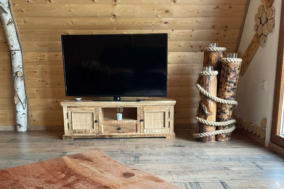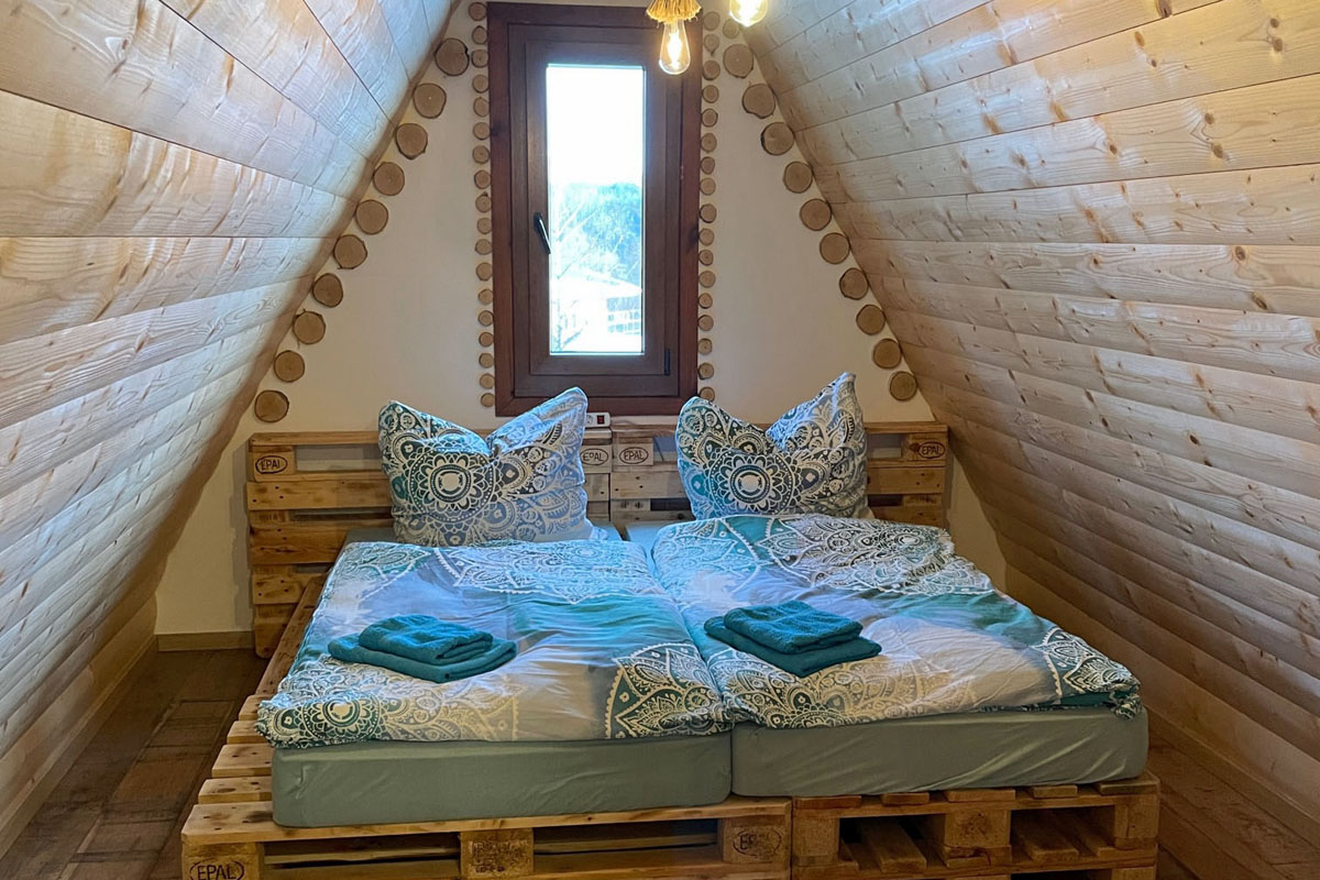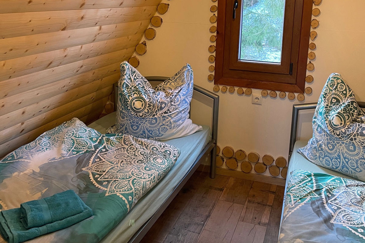 Die Finnhütten besitzen jeweils zwei Schlafzimmer. Wir bieten Ihnen zwei verschiedene Ausführungen: zum Einen ein Doppelbett und zwei Einzelbetten und andererseits fünf einzelne Betten.