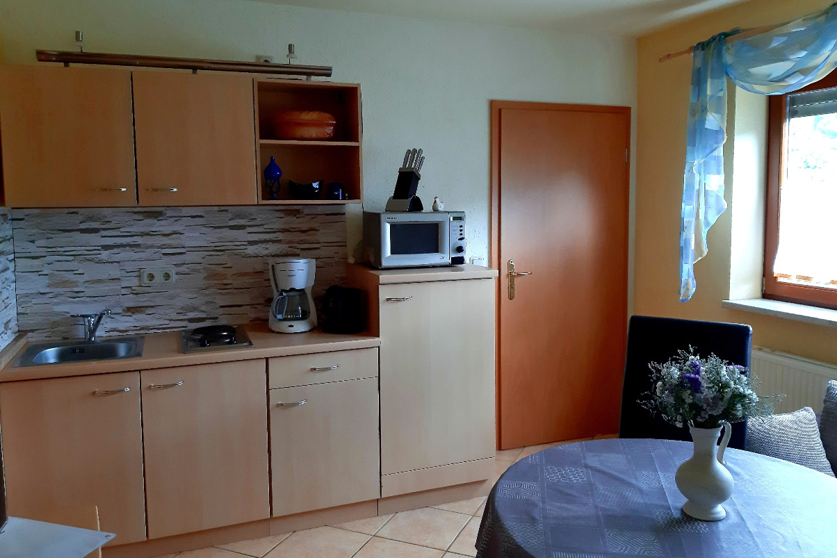 Unsere neu eingerichtete Ferienwohnung (34 qm) liegt in ruhiger Lage am Ortrand von Laudenbach, ein Ortsteil von Trusetal.