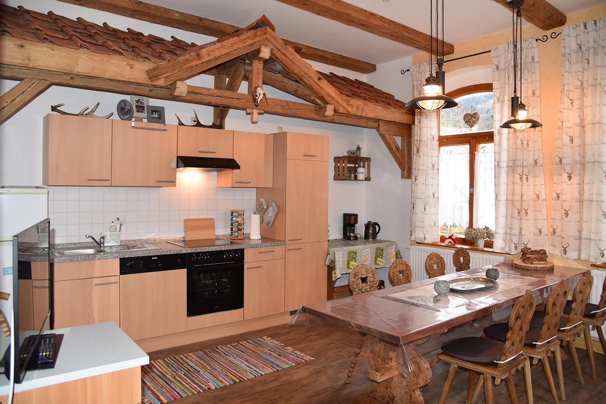 Ein weiteres Highlight ist die gemeinsame rustikale Wohnküche. Der Küchenbereich ist komplett mit Elektroherd, Geschirrspüler und 2 Kühlschränken einschließlich Tiefkühlfächern bestückt. Selbstverständlich stehen auch Geräte zur Kaffee- und Teezubereitung zur Verfügung.