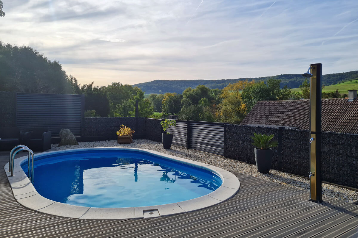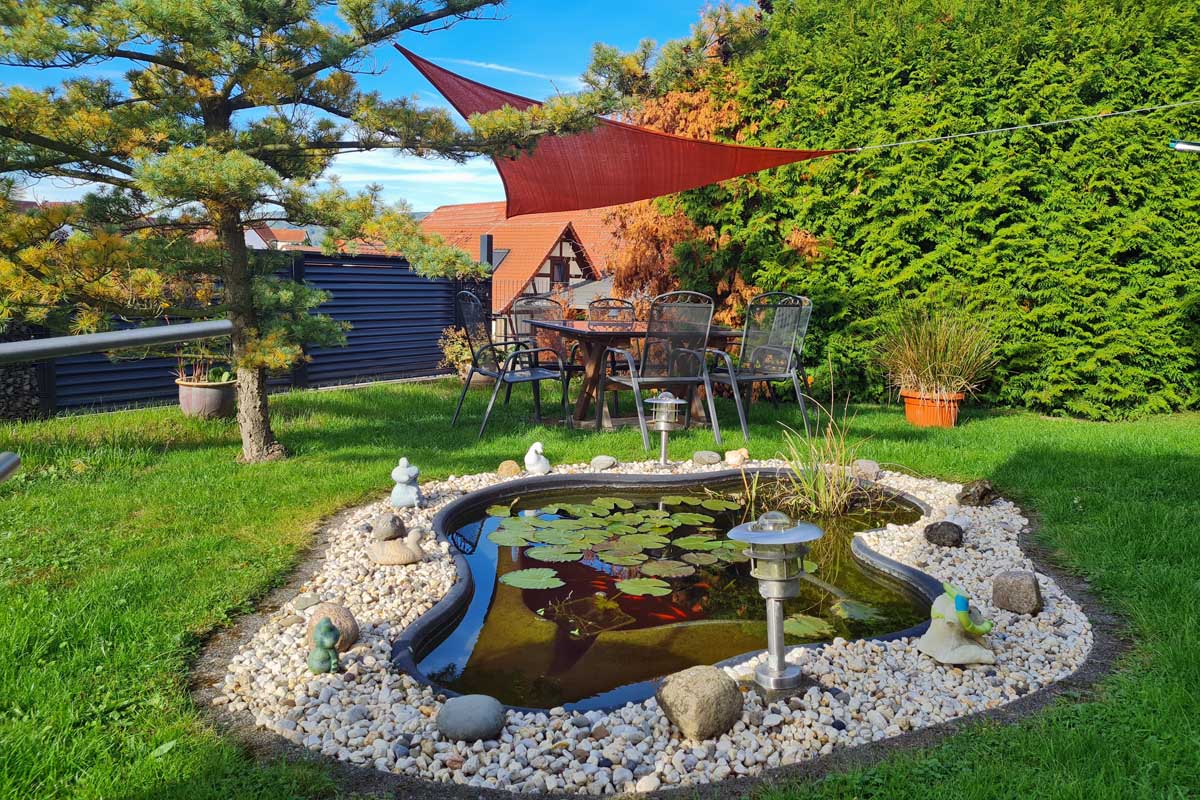 Die Ferienwohnung und das Gästezimmer befinden sich in einem separaten, liebevoll sanierten Fachwerkhaus auf unserem Grundstück. Geniessen Sie von Ihrem Balkon den Blick ins Grüne. Ein kleiner Pool im Gartenbereich lädt zum Abkühlen ein.