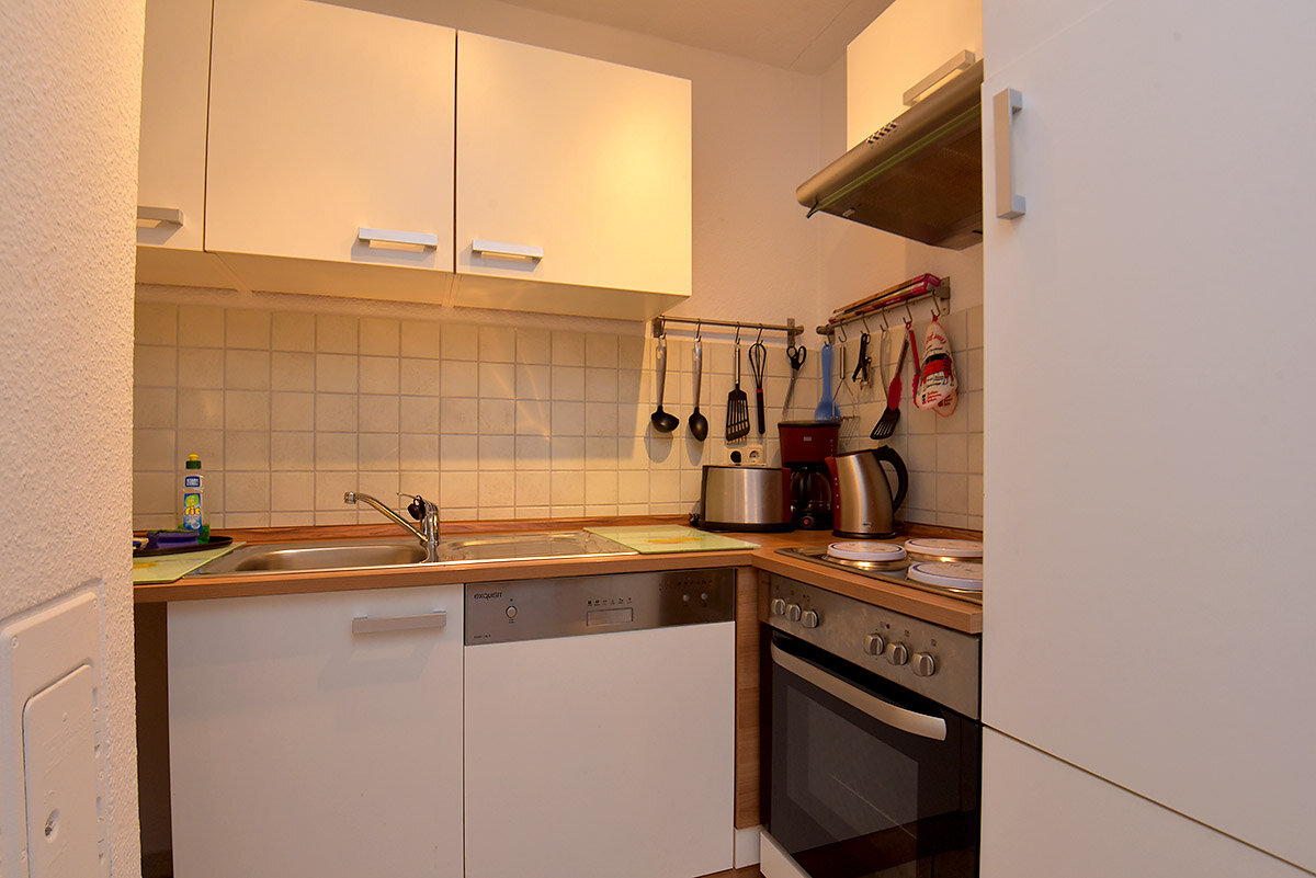 Die gut ausgestattete Küchenzeile verfügt neben einer Spülmaschine, Kaffeemaschine, Wasserkocher und Mikrowelle, über einen Kühlschrank mit Gefrierfach sowie über eine behagliche Fussbodenheizung. Ein geräumiges Bad mit Dusche, WC und Waschbecken verfügt ebenfalls über eine Fussbodenheizung.