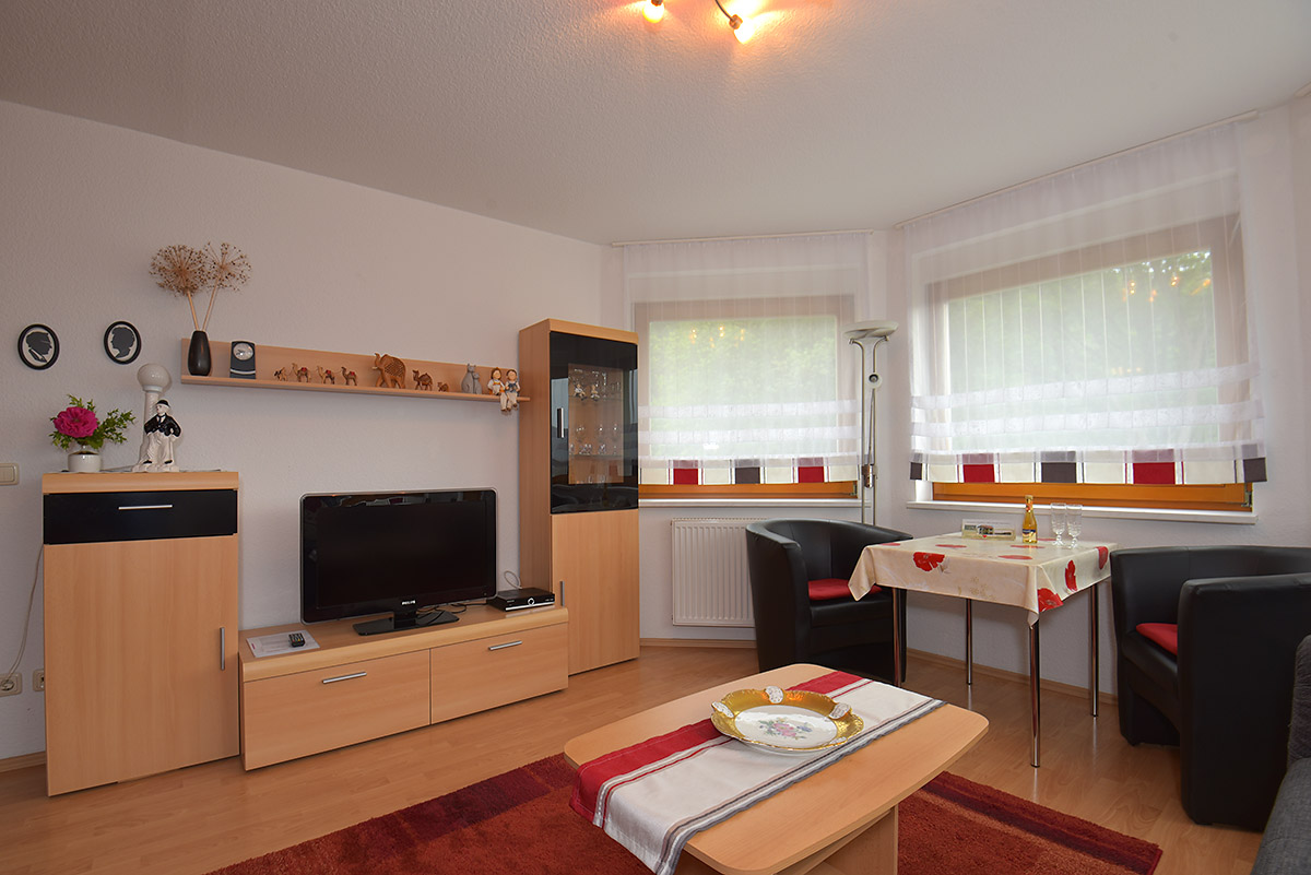 Das Wohnzimmer ist mit einem Raumteiler in Wohn- und Schlafbereich unterteilt. Ein großzügiges Doppelbett 2,00 x 2,00 Meter groß und einen Kleiderschrank sowie Nachtschränkchen mit Leselampen gehören zur Ausstattung des Schlafbereiches. Im Wohnbereich, der durch einen achteckigen Erkeranbau einen besonderen Charme vermittelt, erwarten Sie eine Anbauwand, LCD-Fernseher und CD-Radio sowie eine ausziehbare Schlafcouch mit Tisch. Für eine fünfte Person können wir ein Reisebett aufstellen. Zwei gemütliche Sessel und ein Esstisch komplettieren unser Angebot.