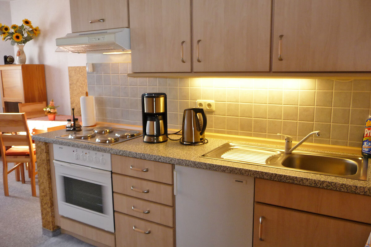 Eine moderne Küchenzeile mit 4-Platten-Elektroherd mit Backröhre, Dunstabzugshaube, Kühlschrank, Wasserkocher, Toaster, Kaffeemaschine, ausreichend Geschirr und Gläser lässt für die Selbsversorgung an nichts fehlen.