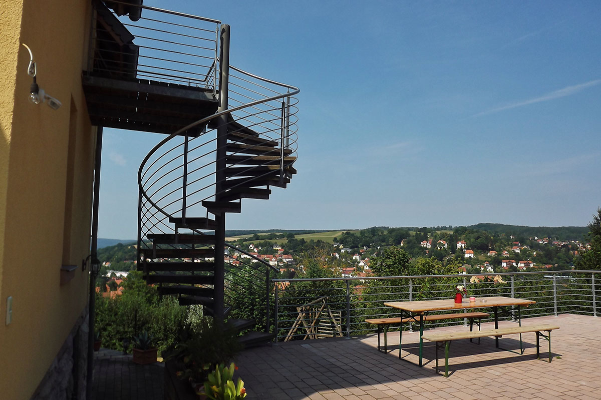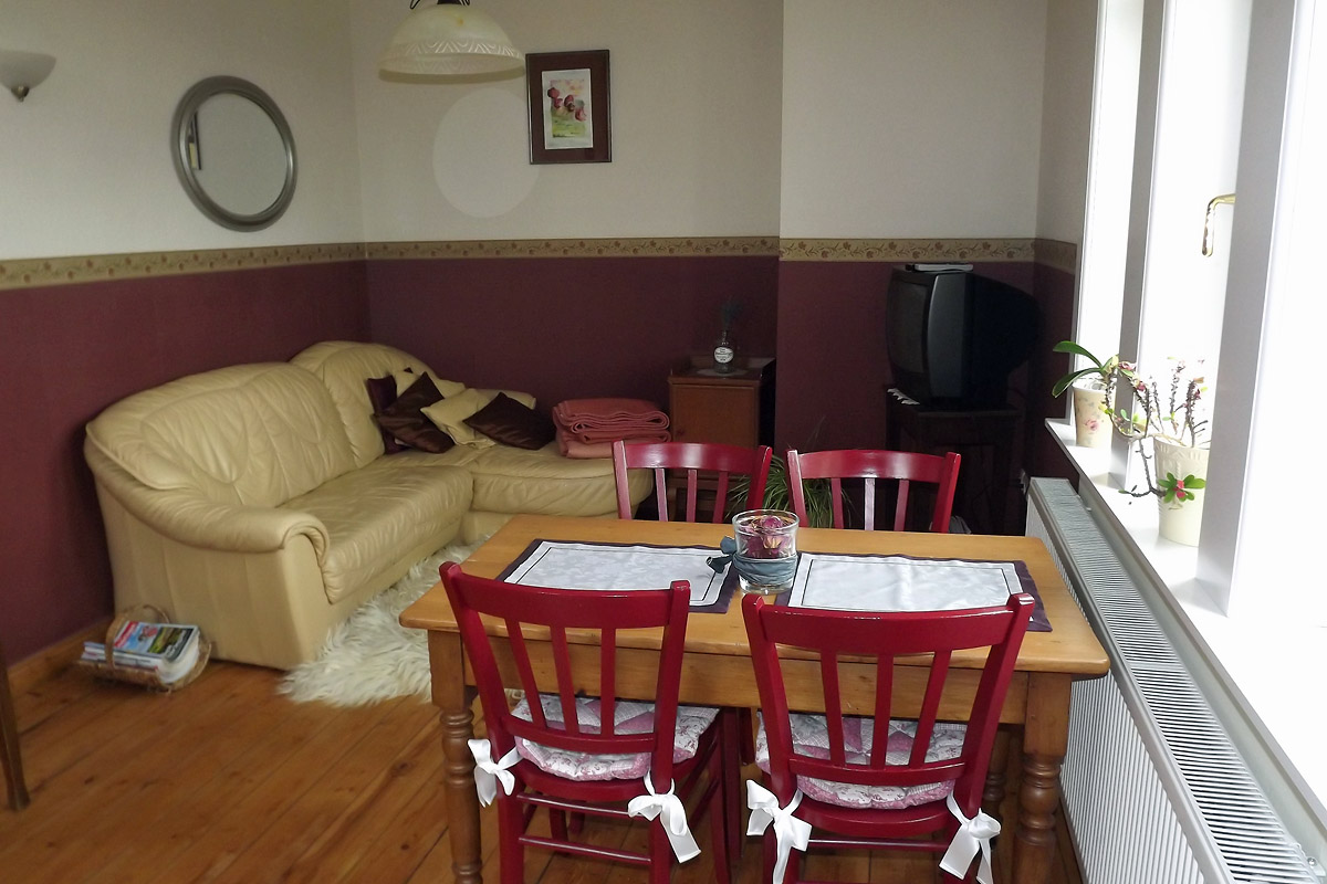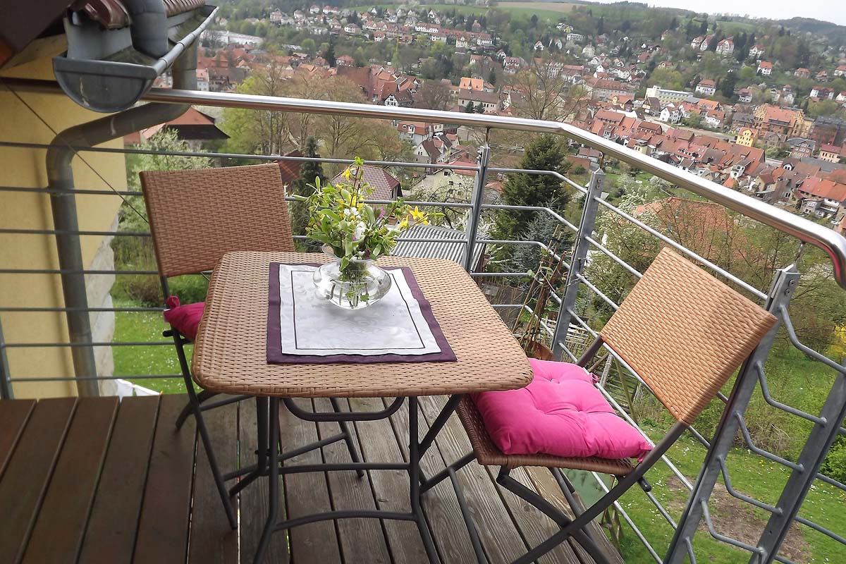 Von Ihrer Ferienwohnung haben Sie einen herrlichen Blick über die Stadt Schmalkalden sowie bis zur Rhön. Über einen separaten Eingang erreichen Sie die Wohnung in der ersten Etage. Sie ist mit viel Liebe zum Detail eingerichtet und verfügt über eine kleine Diele, ein Wohnraum mit Essecke und Küchenzeile, ein Badezimmer, ein Schlafraum mit Doppelbett sowie eine "Zwergenetage" mit zwei Schlafmatratzen.