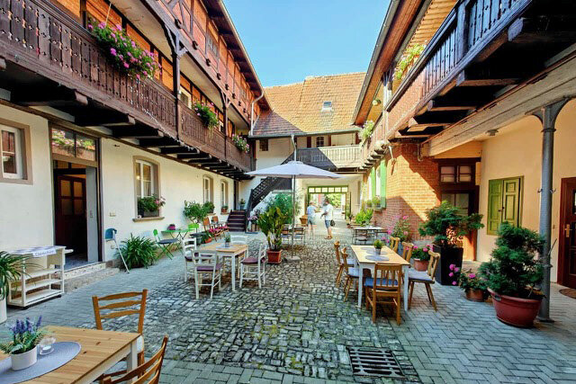 Das Gehöft bezaubert durch einen dreiseitigen Laubengang im Innenhof, welcher ländlich-südliche Atmosphäre ausstrahlt. Durch die zentrale Lage des „Alten Kontors“ sind alle Geschäfte, wie Bäcker, Lebensmittelladen, aber auch mehrere Restaurants und der Kurpark an der Ilm schnell zu Fuß zu erreichen. Trotzdem liegt das Gehöft sehr ruhig, da es sich in einer Sackgasse und Spielstraße befindet.