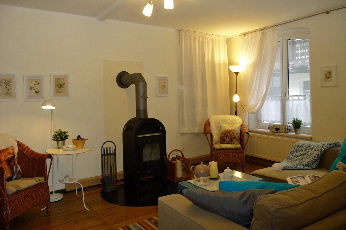 Sie verfügt über ein gemütliches Wohnzimmer mit Sofa und zwei separate Schlafzimmer. Es ist ausreichend Platz für geselliges Zusammensein, aber auch für individuelle Ruhe vorhanden. Ländliche Gemütlichkeit wird ergänzt durch moderne Annehmlichkeiten. In der kälteren Jahreszeit sorgt neben der Gasheizung ein Kaminofen für behagliche Wärme.