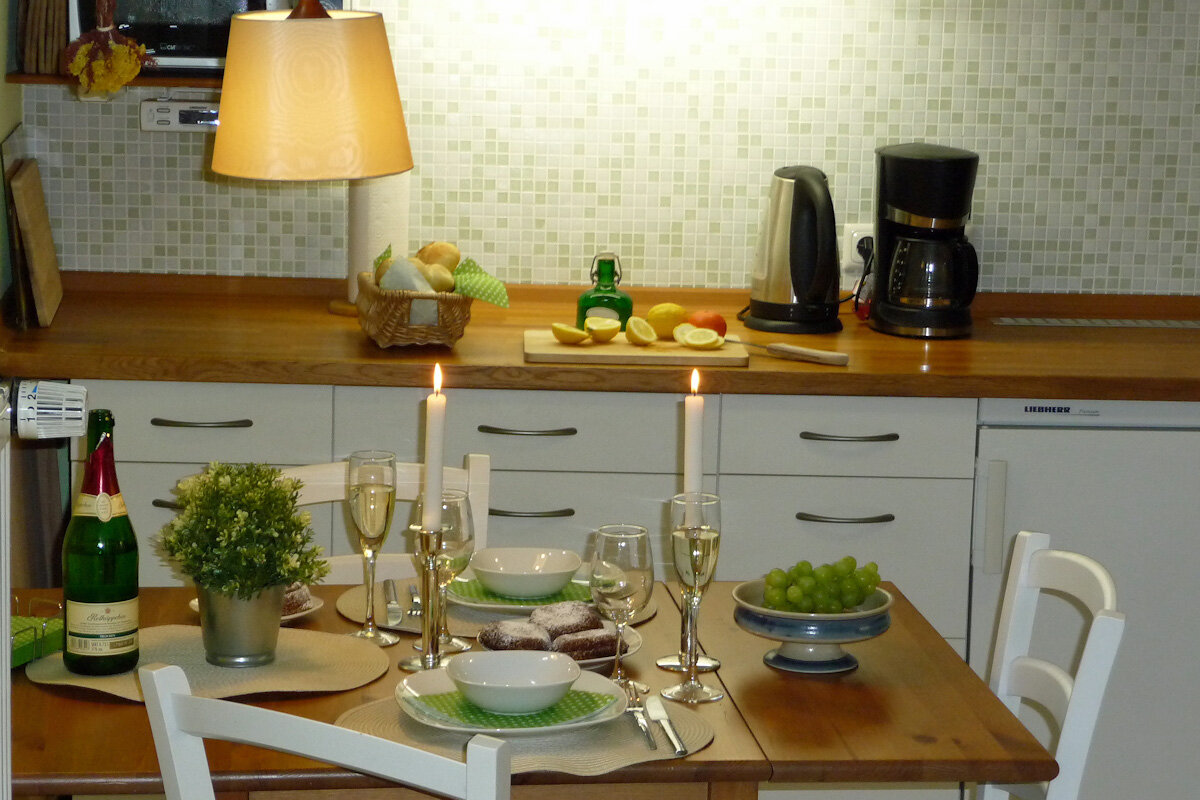 Der Nichtraucherraum eignet sich besonders für kleine Feiern und Treffen von maximal 20 Personen und kann in Ergänzung zu der Ferienwohnung, aber auch allein gemietet werden. Er ist vom Innenhof und von der Straße aus zu erreichen, so dass Lebensmittel und Getränke direkt vom Auto aus hineingetragen werden können. Der gemütliche 40 qm große Gastraum bietet eine variable Gestaltung der Tische an, so dass sowohl eine lange Tafel mit zusätzlichem Buffet, als auch eine aufgelockerte Caféatmosphäre möglich ist. Eine Bar mit Stühlen eröffnet den Blick in die dazugehörige Küche. Diese ist mit allem Geschirr und modernen Geräten ausgestattet, dass eine unbeschwerte Feier möglich ist. Zugehörig zum Feierraum ist ein Flur mit Garderobe und eine Toilette, welche beide zum Innenhof hin liegen. An Sommertagen kann auch der Innenhof genutzt werden.