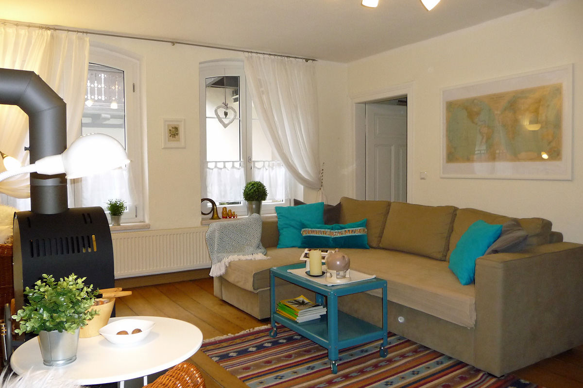 Dicke Lehmwände schenken der Wohnung im Sommer angenehme Kühle und im Winter behagliche Wärme. Die großzügige 76 qm große Nichtraucherwohnung ist über den Innenhof mit einem separaten Eingang zu erreichen und befindet sich im Erdgeschoß.
