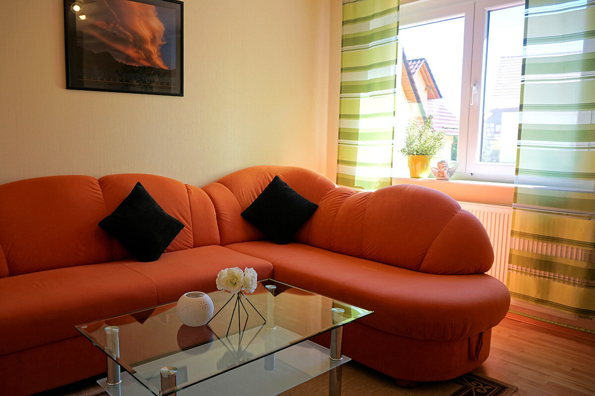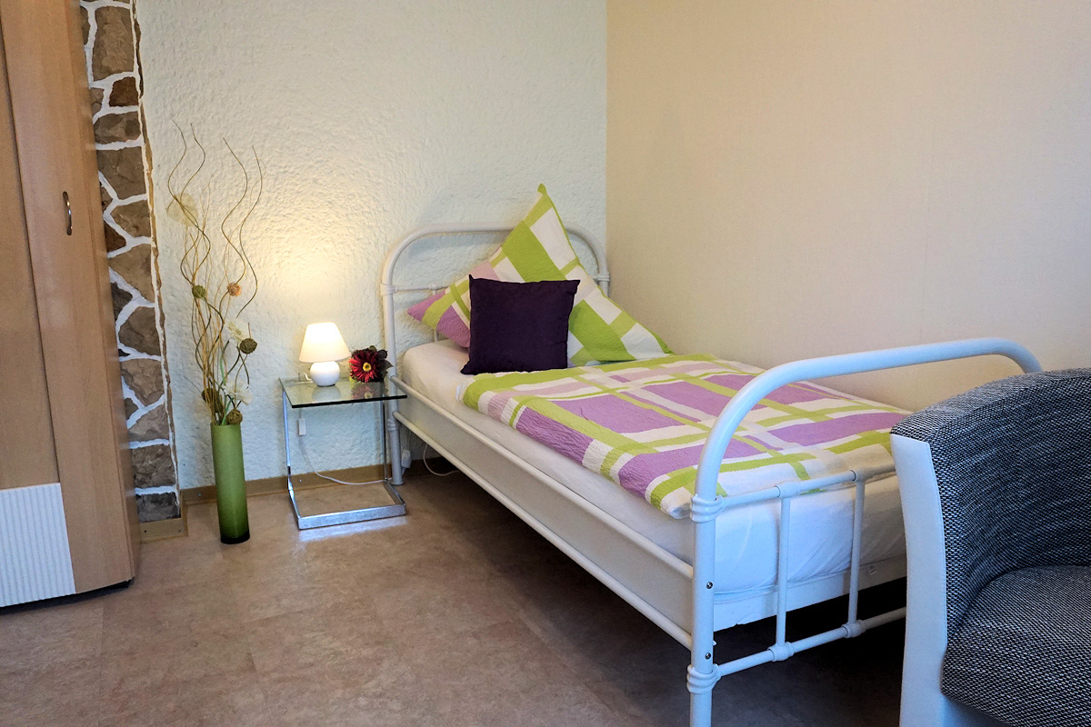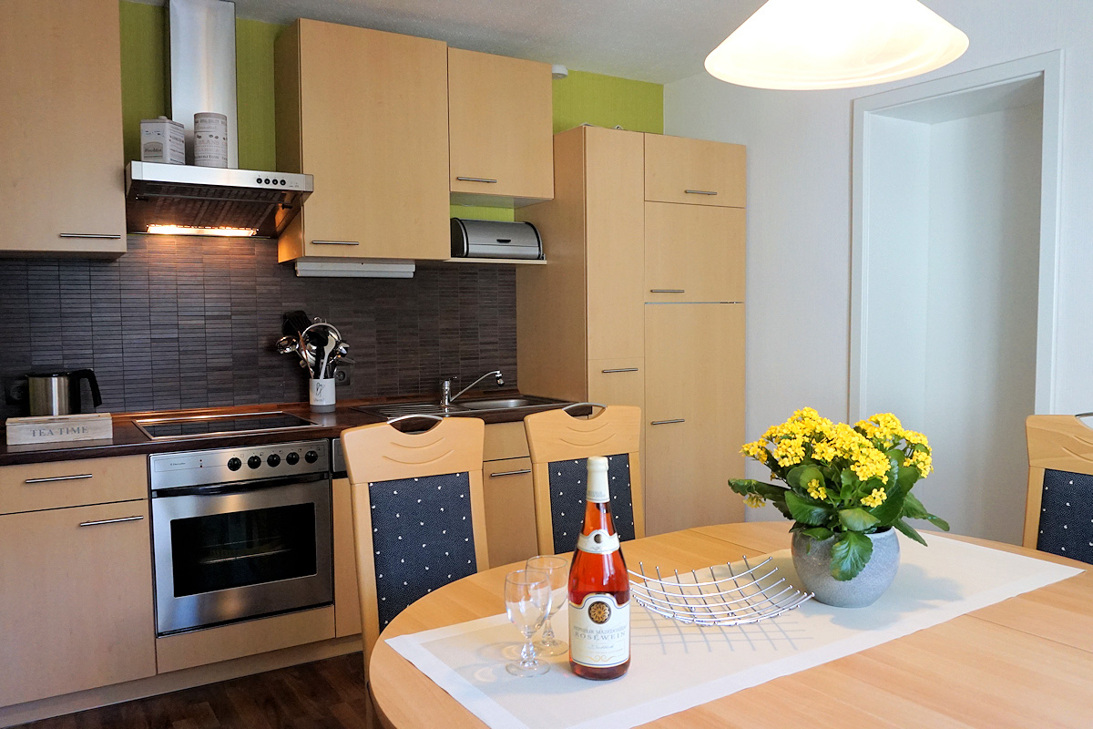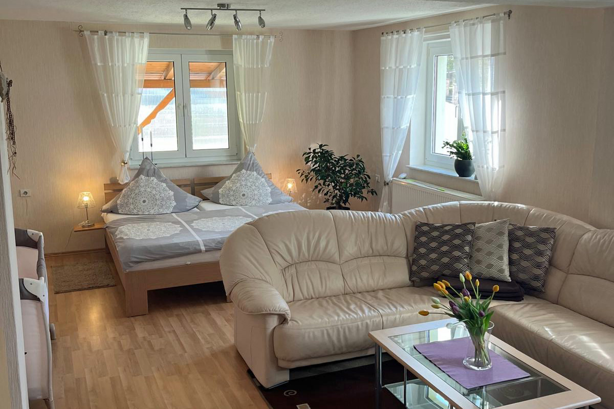 Unsere komfortabel eingerichtete Nichtraucher-Ferienwohnung (je Bedarf 60 oder 90 qm, separater Eingang) bietet ausreichend Platz für 5 Personen und befindet sich im Erdgeschoss unseres Wohnhauses. Die Ferienwohnung verfügt über ein Bad mit WC und Badewanne (als Duschmöglichkeit), eine modern eingerichtete Wohnküche, ein Schlafzimmer mit Doppelbett und ein großzügiges Wohnzimmer (2 Einzelbetten), ein separates kleines Wohnzimmer mit Doppelbettcouch, sowie ein Zimmer mit Einzelbett.