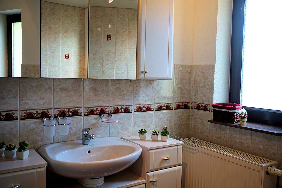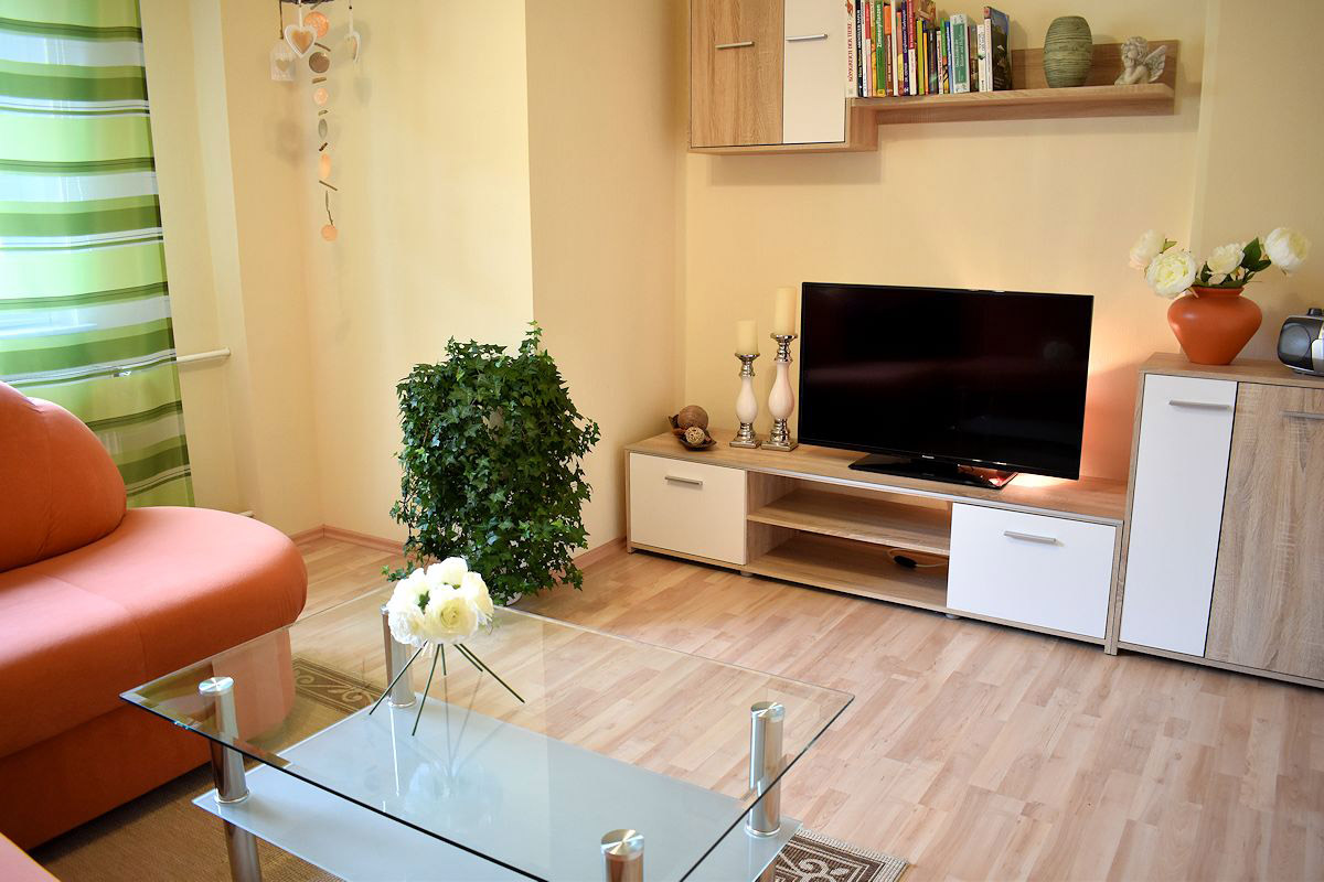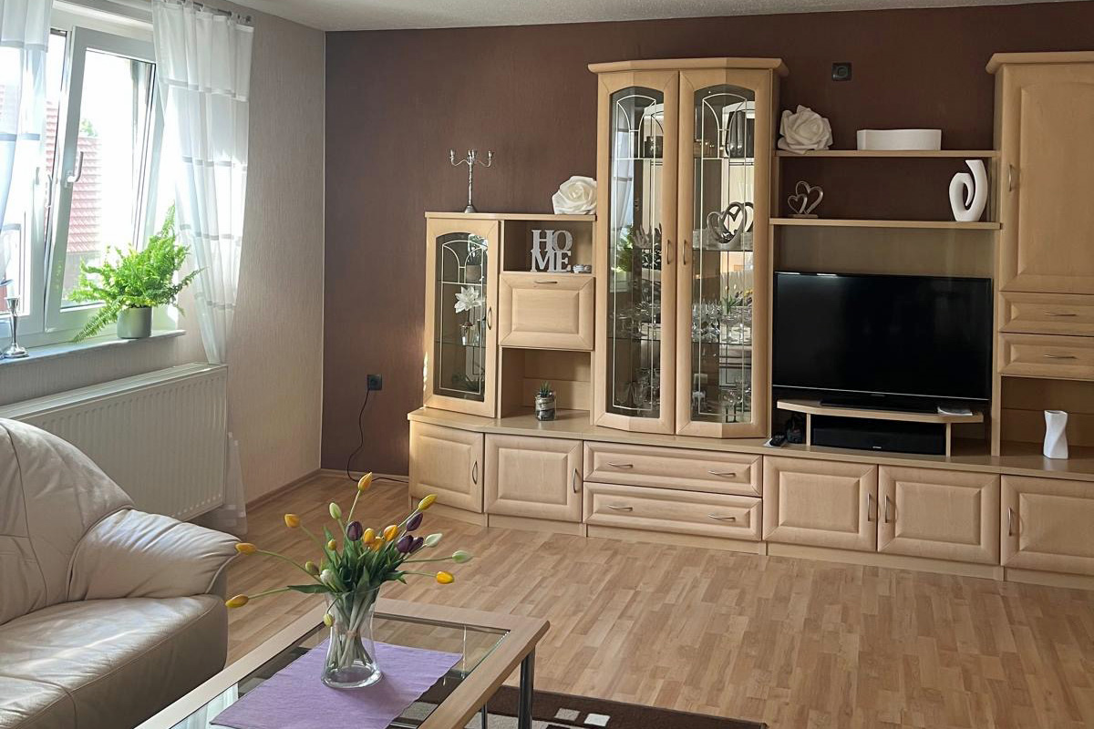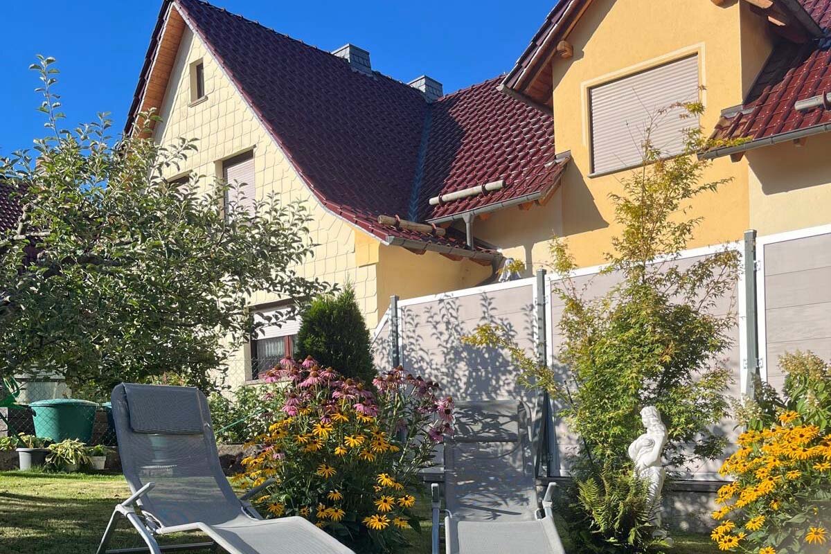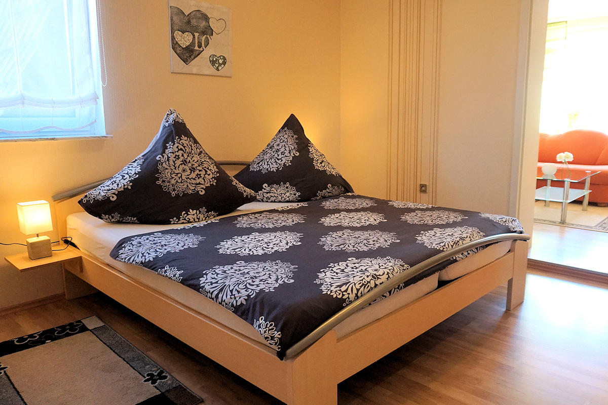 Unsere komfortabel eingerichtete Nichtraucher-Ferienwohnung (je Bedarf 60 oder 90 qm, separater Eingang) bietet ausreichend Platz für 5 Personen und befindet sich im Erdgeschoss unseres Wohnhauses. Die Ferienwohnung verfügt über ein Bad mit WC und Badewanne (als Duschmöglichkeit), eine modern eingerichtete Wohnküche, ein Schlafzimmer mit Doppelbett und ein großzügiges Wohnzimmer (2 Einzelbetten), ein separates kleines Wohnzimmer mit Doppelbettcouch, sowie ein Zimmer mit Einzelbett.
