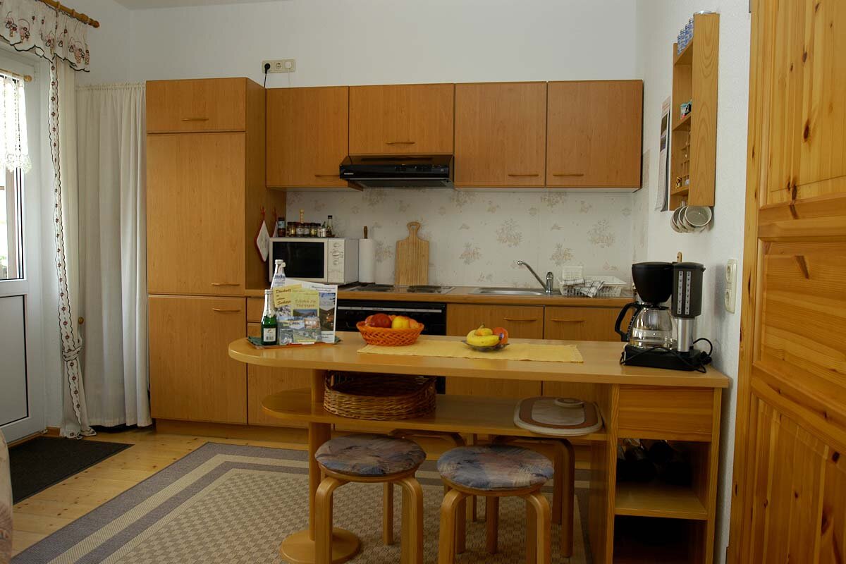 Die Kücheneinrichtung besteht aus einem Elektroherd, Kühlschrank und Spüle. Zahlreiche elektrische Geräte wie Toaster, Mikrowelle, Brotschneidemaschine, Eierkocher, Kaffeemaschine, Wasserkocher und Rührgerät ergänzen die Ausstattung.
