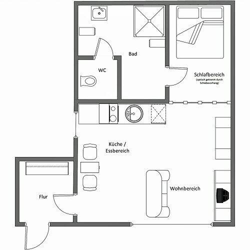 Der Schlafbereich ist optisch vom Wohnbereich durch einen modernen Schiebevorhang unterteilt. Ein modernes Bad mit Dusche, Waschbecken, Fön und einem separat abgeteilten WC runden unser Angebot ab.