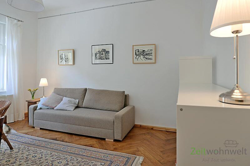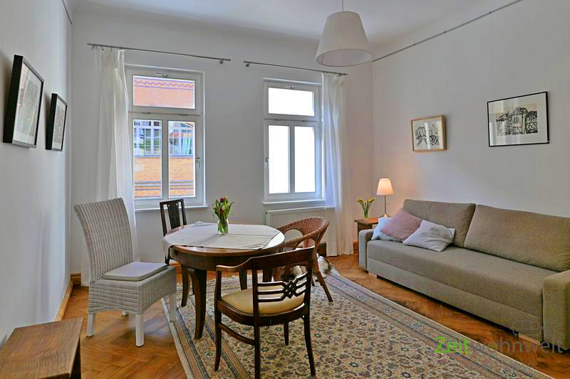 Das Wohnzimmer mit Blick auf die Universität in der Brauhausgasse bietet eine gemütliche Couch (auch als hochwertige Schlafgelegenheit für 2 Personen nutzbar), einen Essplatz und ein Unterhaltungsprogramm wie zu Hause: Bücher, Spiele, WLAN. Das große Schlafzimmer ist ausgestattet mit einem Doppelbett und genügend Stauraum auch für einen längeren Aufenthalt.