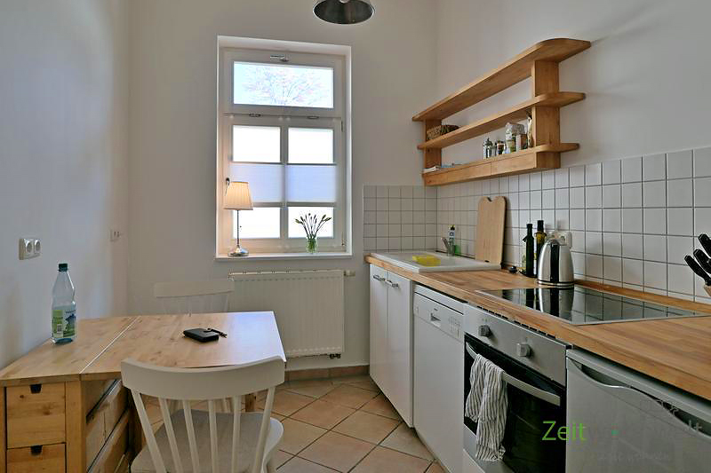 Küche und Bad sind modern gefliest und bieten allen Komfort der eigenen Wohnung. Das Bad besticht durch seine Größe und sowohl Badewanne und Duschkabine. In der Küche können Sie sich mit einem hochwertigem Herd und umfangreichen Kücheninterieur wie zu Hause fühlen und mit Blick auf den Laubengang gemütlich aufhalten.