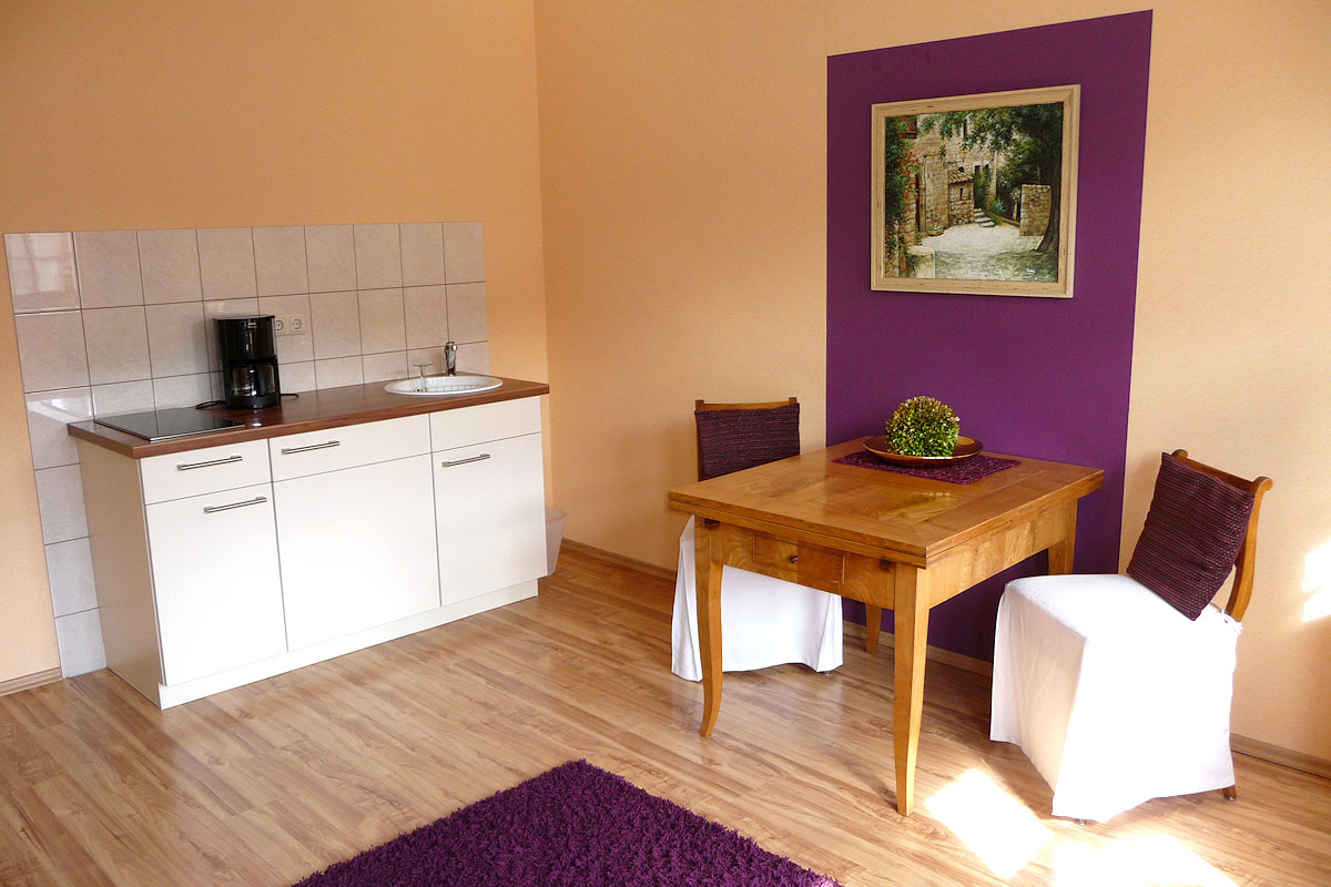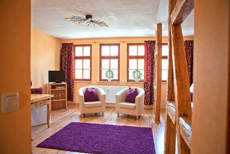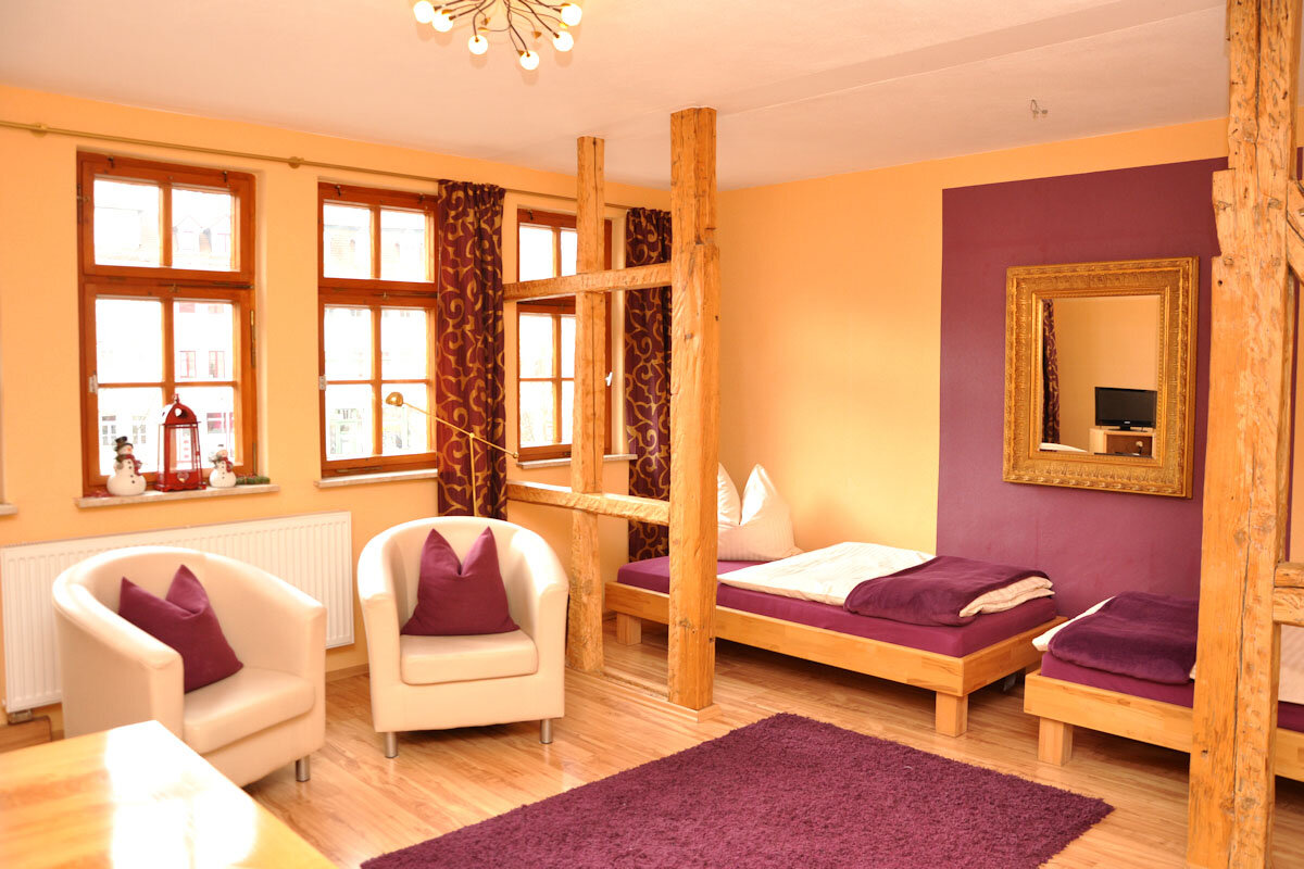 Ihre im ersten Obergeschoss liegende Ferienwohnung befindet sich in einem der ältesten Häuser im Herzen Apoldas, welches nach umfangreichen Sanierungsarbeiten in neuer Schönheit erstrahlt. Von hier genießen Sie einen schönen Blick auf das historische Rathaus Apoldas und das Marktgeschehen.
