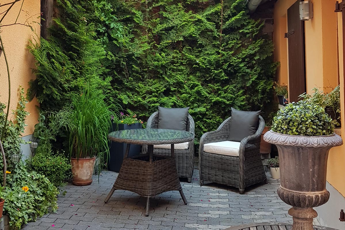 Ihr im mediterranen Stil gestaltetes Appartment besteht aus einem kombinierten Wohn-/Schlafraum mit kleiner Küchenzeile (Herd mit 2-Plattencerankochfeld und Kühlschrank). Das ebenfalls mit hochwertigen Materialien sanierte Bad verfügt über Dusche, ein Waschbecken und WC. Ein kleiner ruhiger begrünter Innenhof erwartet Sie mit einer gemütlichen Sitzecke umgeben von blühenden Pflanzen und einer schönen Natursteinmauer. Hier können Sie entspannt Ihre Tage beginnen und planen, oder aber am Abend bei einem Glas Wein beschließen.