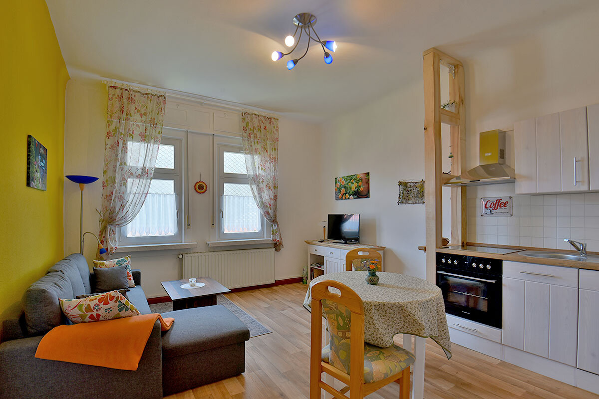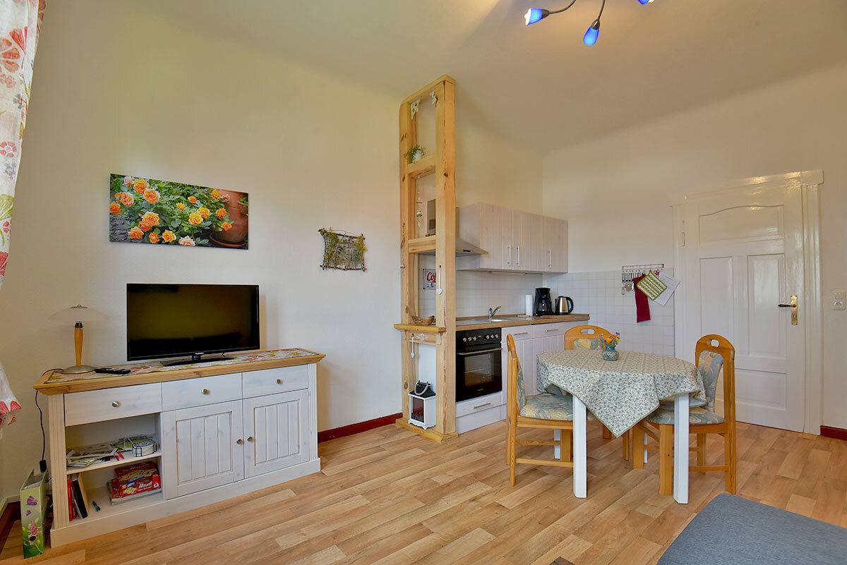 • Wohn-/Essbereich mit Schlafcouch, TV, Esstisch, Küchenzeile (4-Zonen Cerankochfeld, Backofen, Spülmaschine, Kühlschrank, Kaffeemaschine, Wasserkocher etc.)
