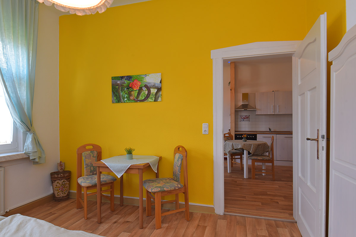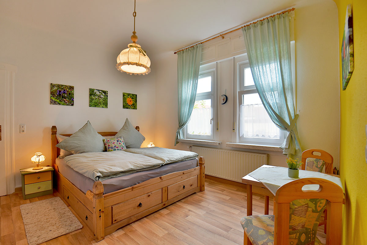 • Schlafzimmer mit Doppelbett (Bettwäsche vorhanden) sowie einem kleinen Tisch mit 2 Stühlen
