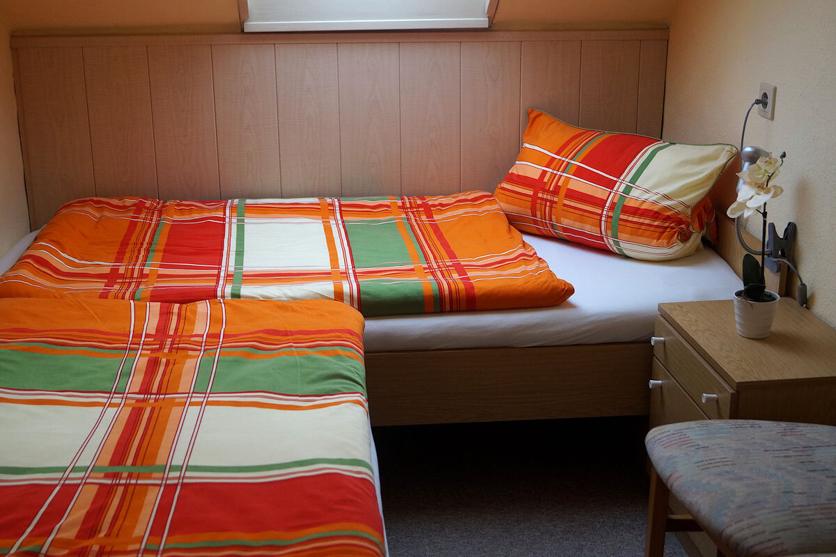 Im Obergeschoss befinden sich ein größeres Schlafzimmer mit einem großen Doppelbett und ein kleineres Schlafzimmer mit 2 Einzelbetten (evtl. für die Kinder).
