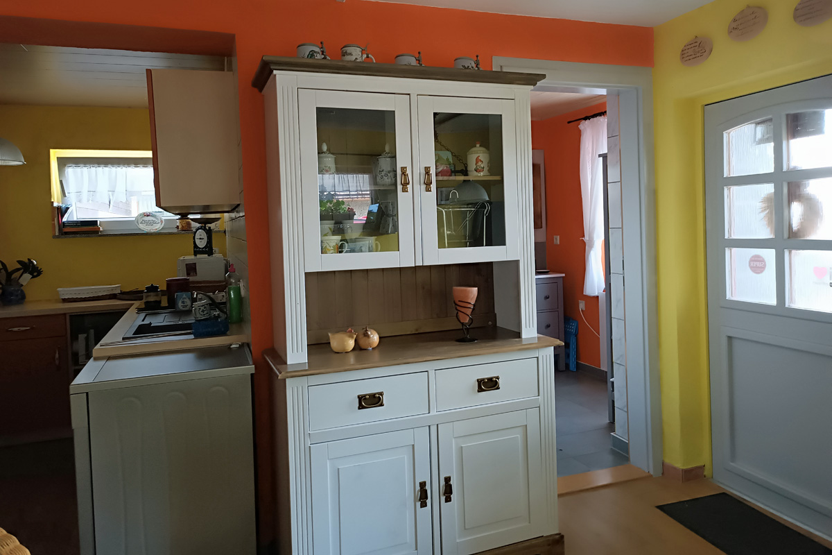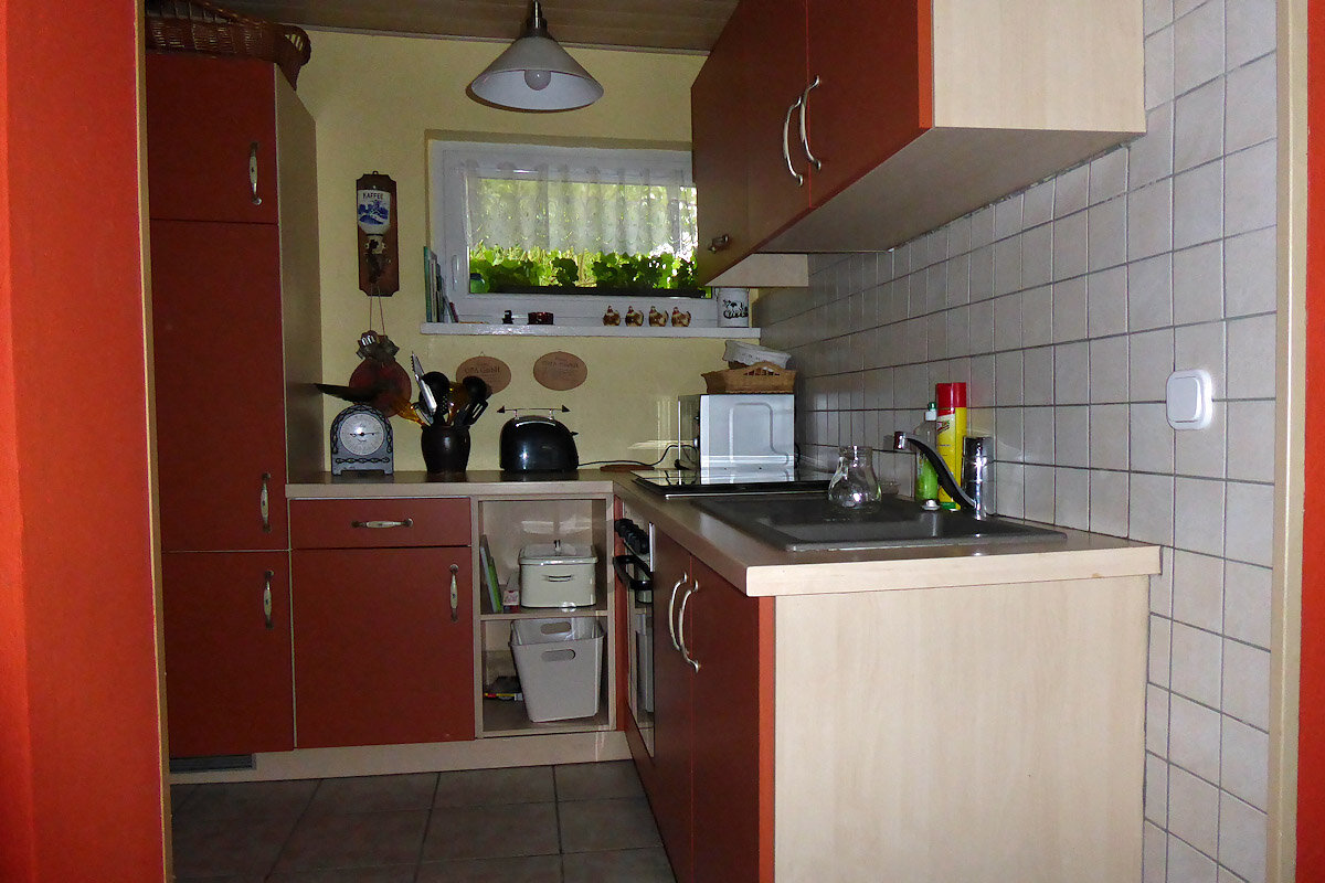 Erdgeschoss: 1 Wohndiele mit Eßplatz/TV, Einbauküche (Kaffeemaschine (rote FH), Kaffeeautomat (grüne FH), Elektroherd/Backofen, Kühlschrank mit Gefrierfach, Mikrowelle, Toaster, Wasserkocher, Geschirrspüler (rote FH) etc.), Dusche/WC und möblierter Terrasse