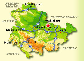 2 km von der nördlichen Stadtgrenze Weimars entfernt, in der Gemeinde Wohlsborn, befindet sich in ruhiger Ortsrandlage unsere Pension "Bärenhügel".