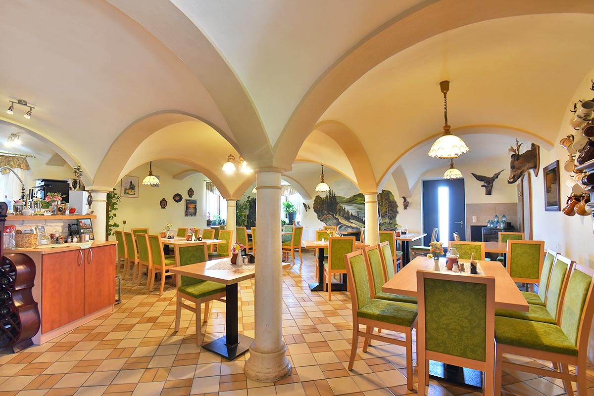 Am Morgen erwartet Sie ein leckeres Frühstücksbuffet unter anderem mit hausschlachtener Wurst. Unser kleiner überdachter Biergarten lädt an warmen Tag ebenfalls zum Verweilen ein.