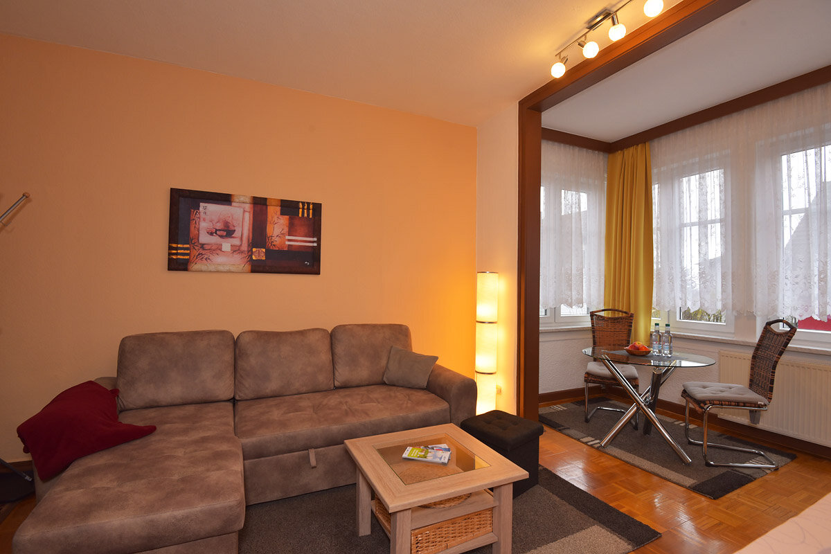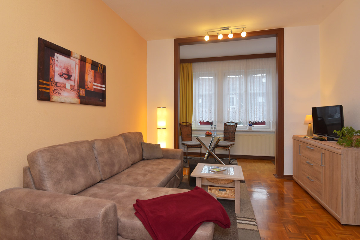 Zur Ausstattung gehören getrenntes Wohn- und Schlafzimmer ebenso wie Dusche / WC, Kabel-TV, Bettwäsche und Handtücher. Kostenfreies WLAN ist selbstverständlich auch vorhanden.